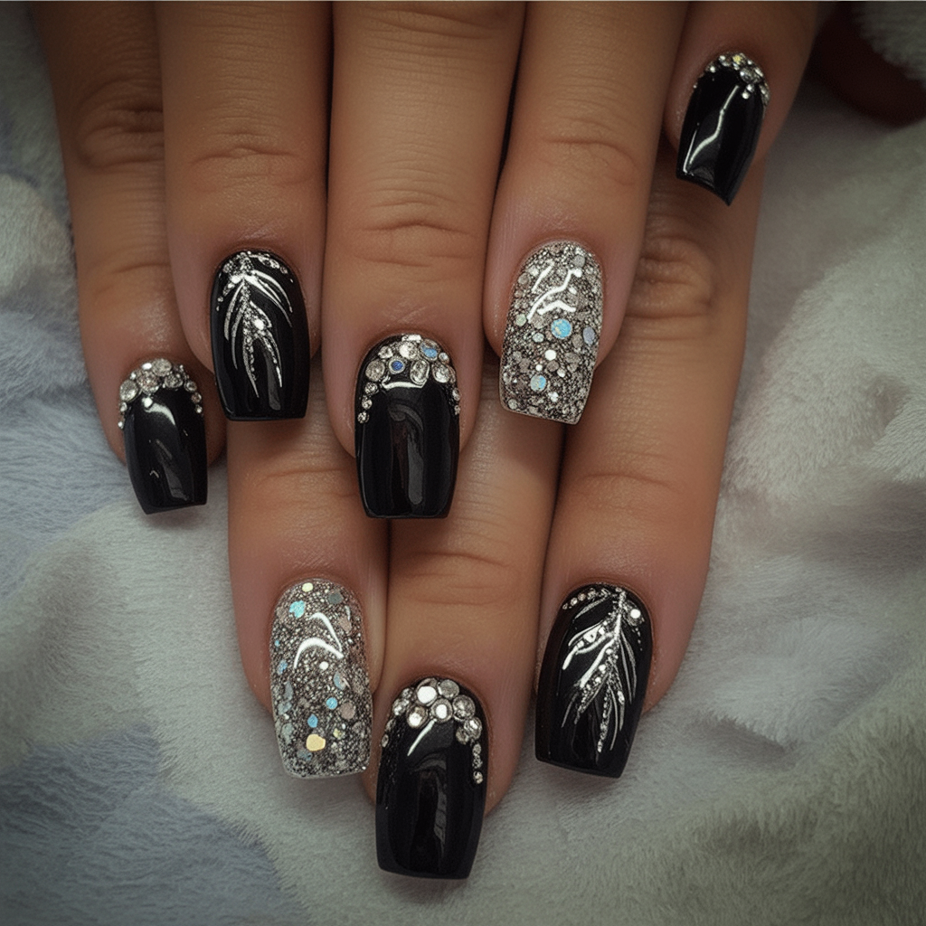 These nails are pure luxury—black polish, silver glitter, and dazzling rhinestones combine to create a glamorous, party-ready manicure. They feel bold, indulgent, and perfect for women who want their nails to sparkle as much as their jewelry.