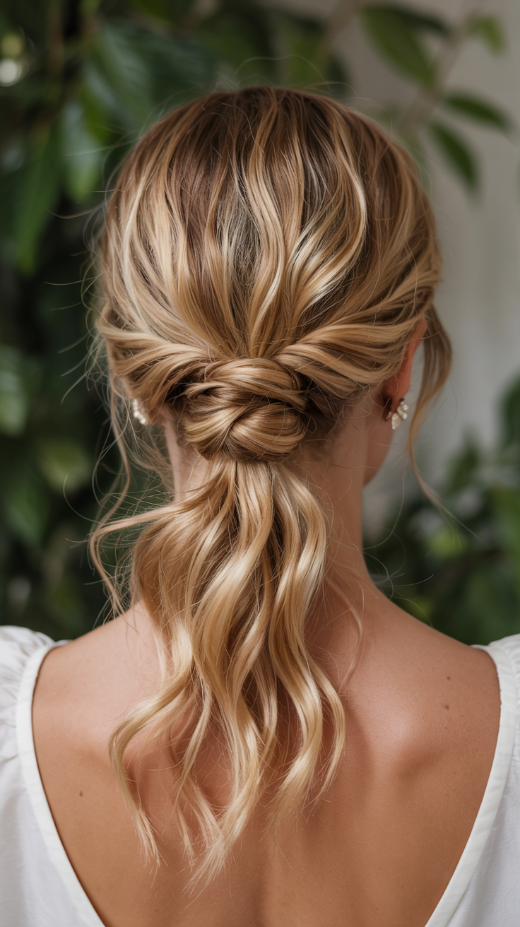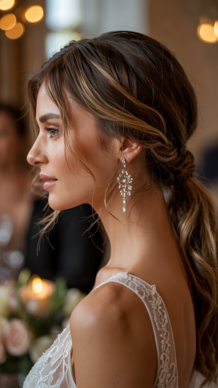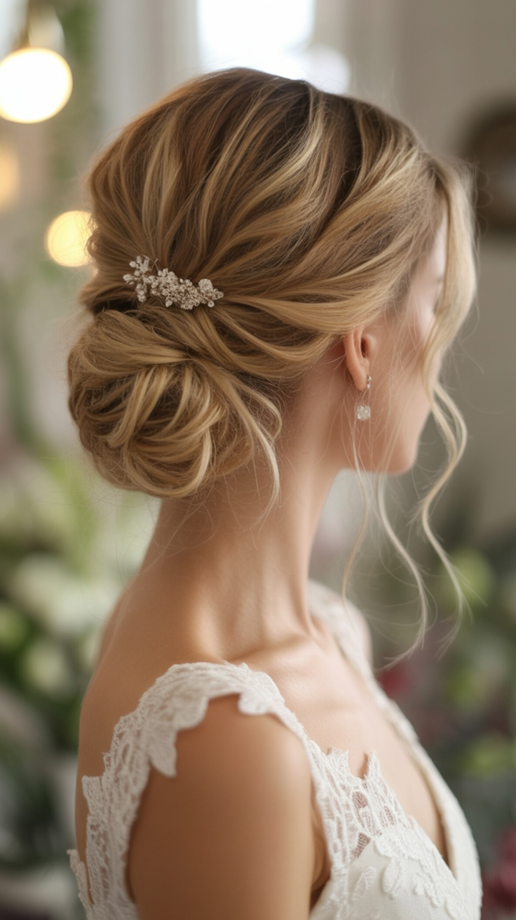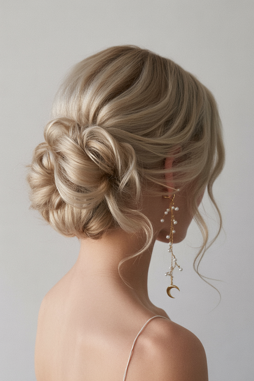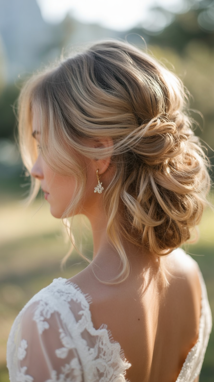 Combining this textured low bun is the perfect combination of timeless romance. Those soft waves are pinned softly into a sophisticated but airy bun and then they have lovely face-framing tendrils creating a dreamy, no-effort kind of look. Add statement earrings and a pairing of this style creates a conversational combination that is decadent and casual and ideal to wear to an elegantly beautiful wedding.