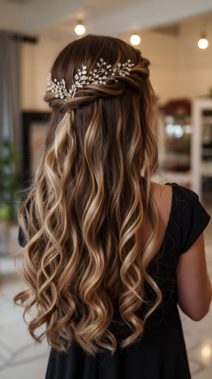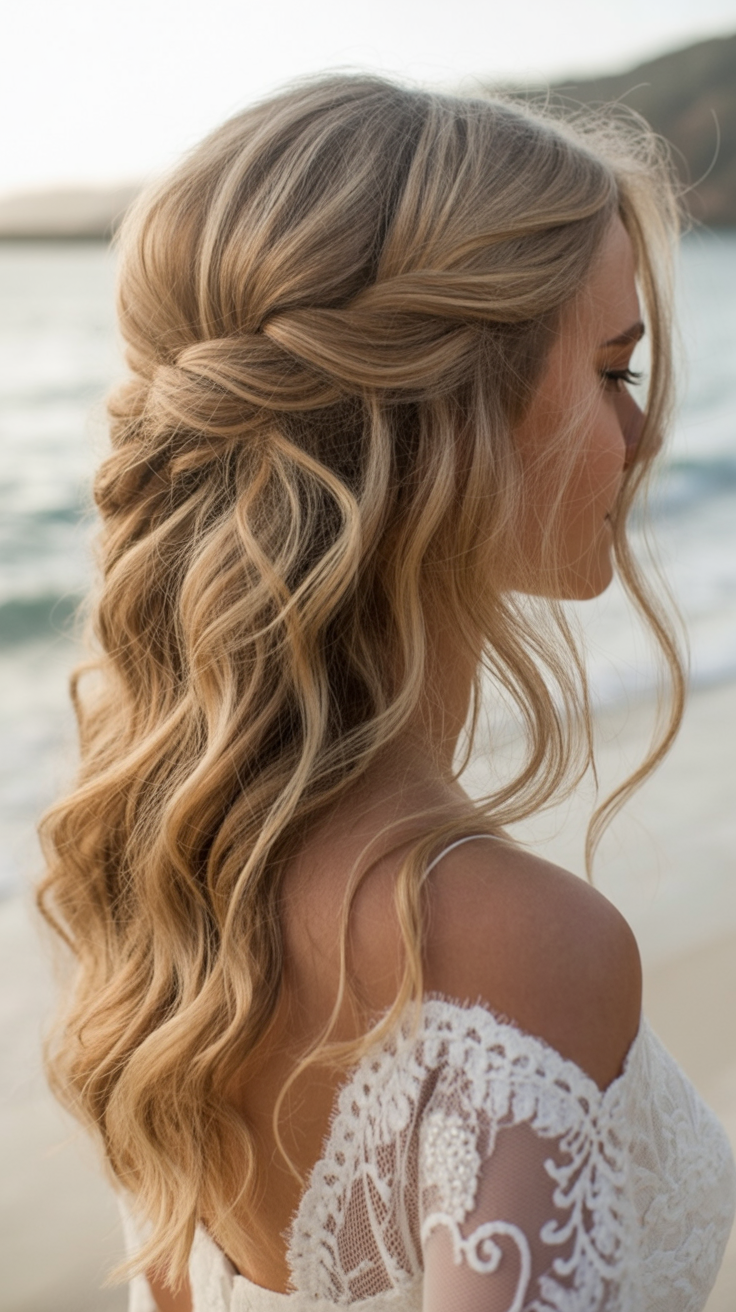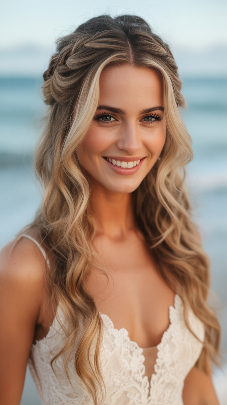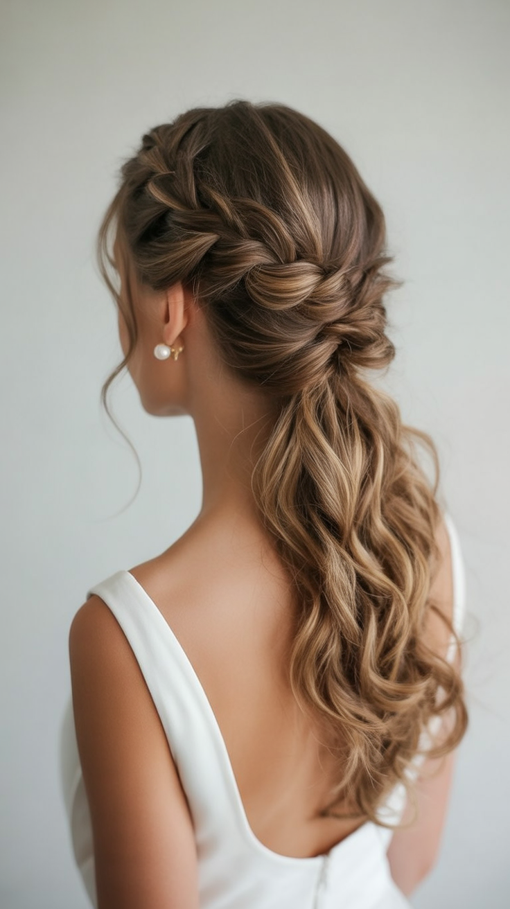 The braided half up manages to be playful and polished at the same time so it is possible that you can have both. The braid serves as a crown of nature and the curled wavy length adds softness and life. It is feminine, romantic and is acing fine when you are walking the aisle or swirling the dancing floor.