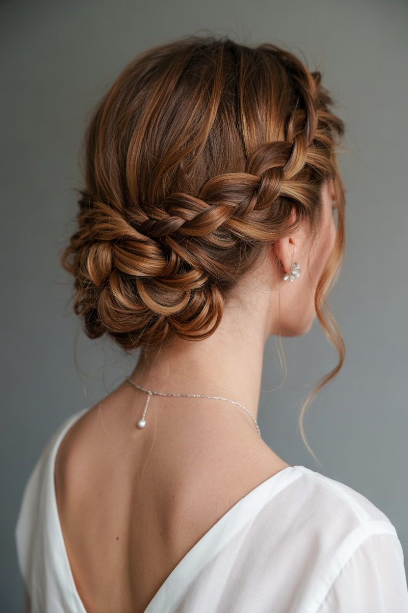 A braided crown, there is something about that that never gets old, it has the appeal of something of the past yet it still feels very current and contemporary. In this case, the braid is swept to the front and naturally blends into a textured low bun, and some soft face-framing strands to complete the look romantics. It is structure and softness at its best making it as photogenic as comfortable.