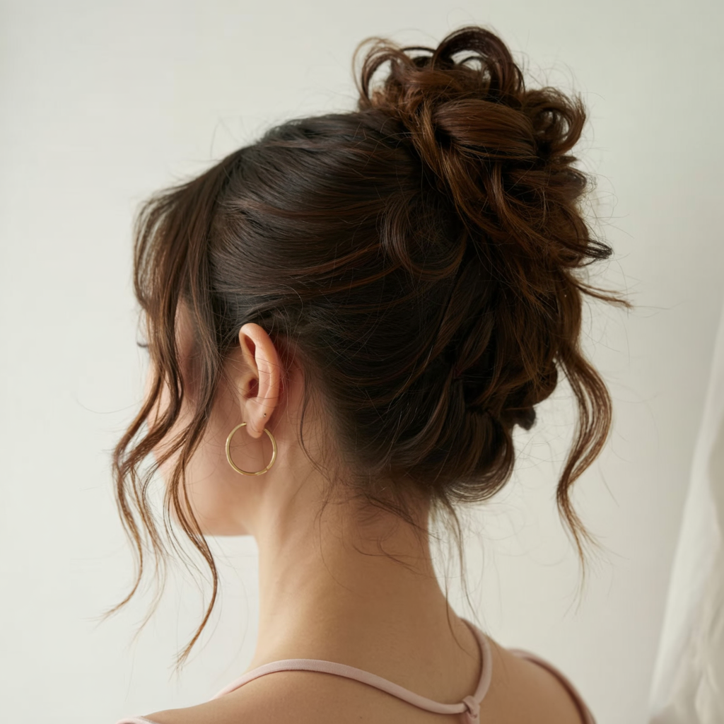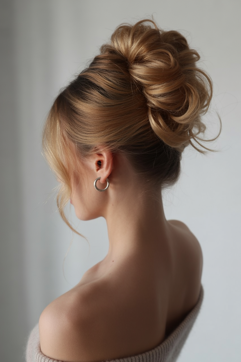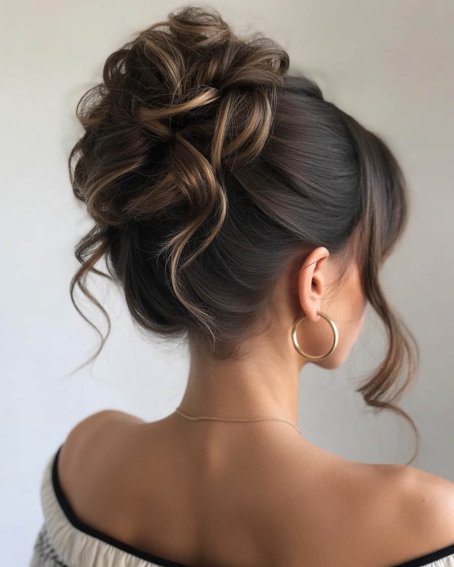 This airy high bun is frivolous and air, tendrils are wispy and loosely framing the neck and the face. The height, which is there to provide the instant form of elegance, is followed up by the loose curls that were woven into the bun so they add dimension and motion to the bun. It is a fashion, which does not fear being caught on camera as much as it does in planned portraits.