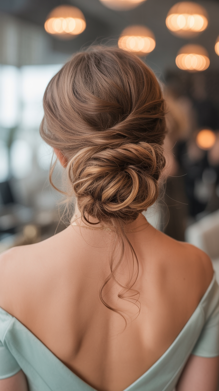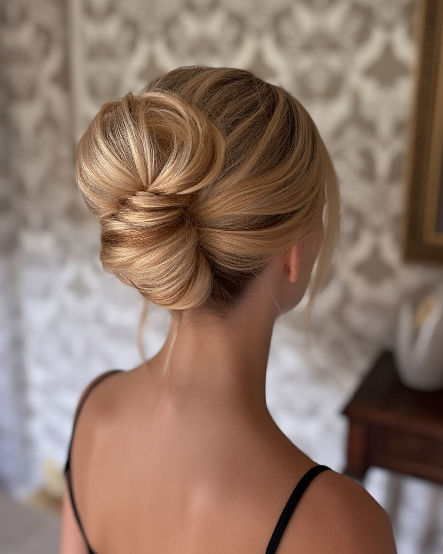 Sophistication seems to have a hairstyle and the hairstyle is this sleek twisted chignon. Its silky folds are even sculpted, giving a sporty and elegant image that seems to be jointly contemporary and traditional. It is perfect when a wedding dress is required in the evening that is formal and the aim is to look glamorous using discretion.