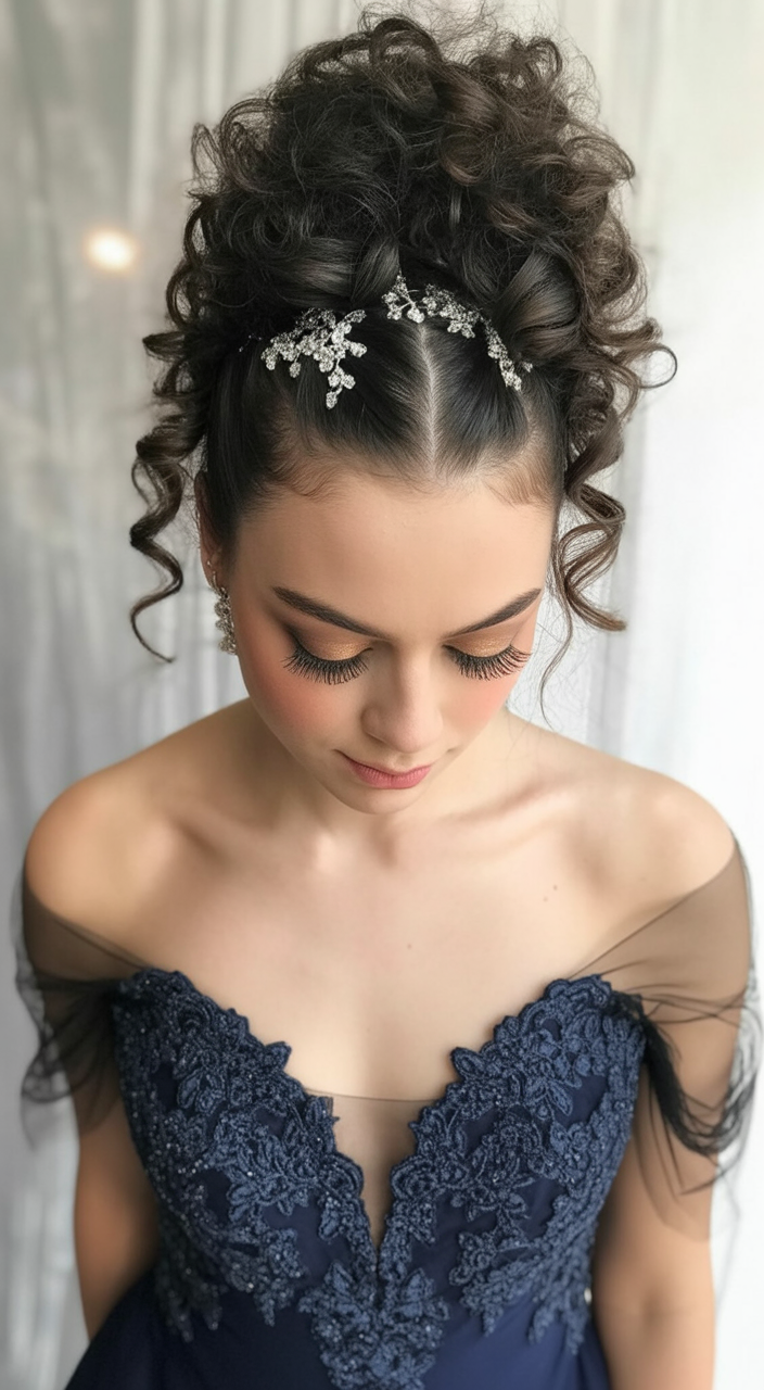 Its crown-like curly high updo fashion with its boldness and majesty is a stunner to any wedding party. The specified curls are heaped up reaching the huge crown effect and a shiny crystal headband provides a perfect amount of glamour. It is dramatic and yet soft and will make a perfect fit to stand out without competing with the bride.