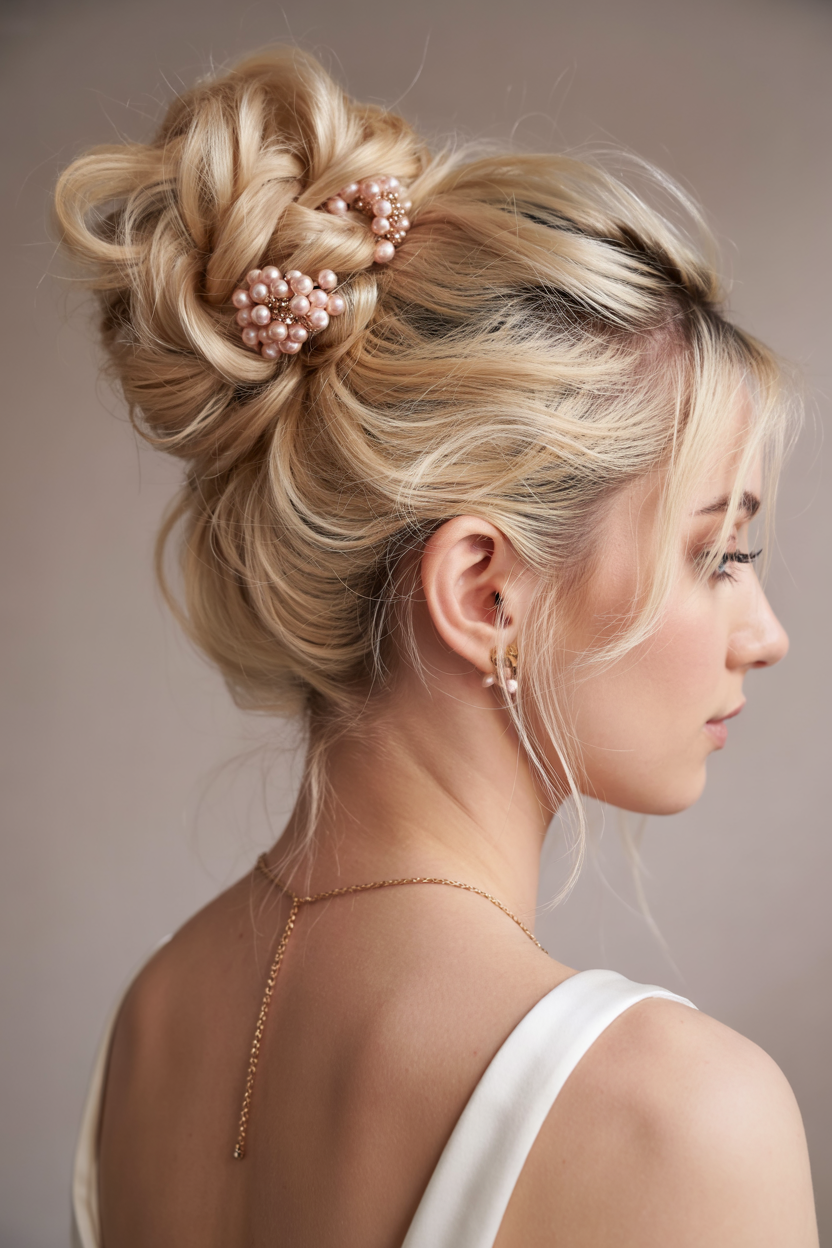 It is a flirty and fun version of a traditional up bun where soft braids have been incorporated into the bun and the clusters of pearls placed strategically. It is intriguing but not excessive, and that is why it is perfect as a dress of a mischievous bridesmaid.