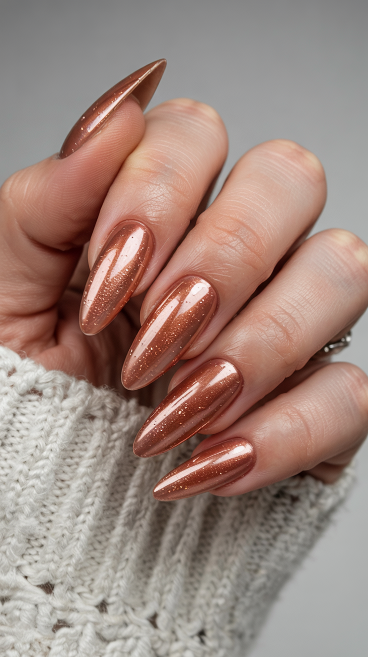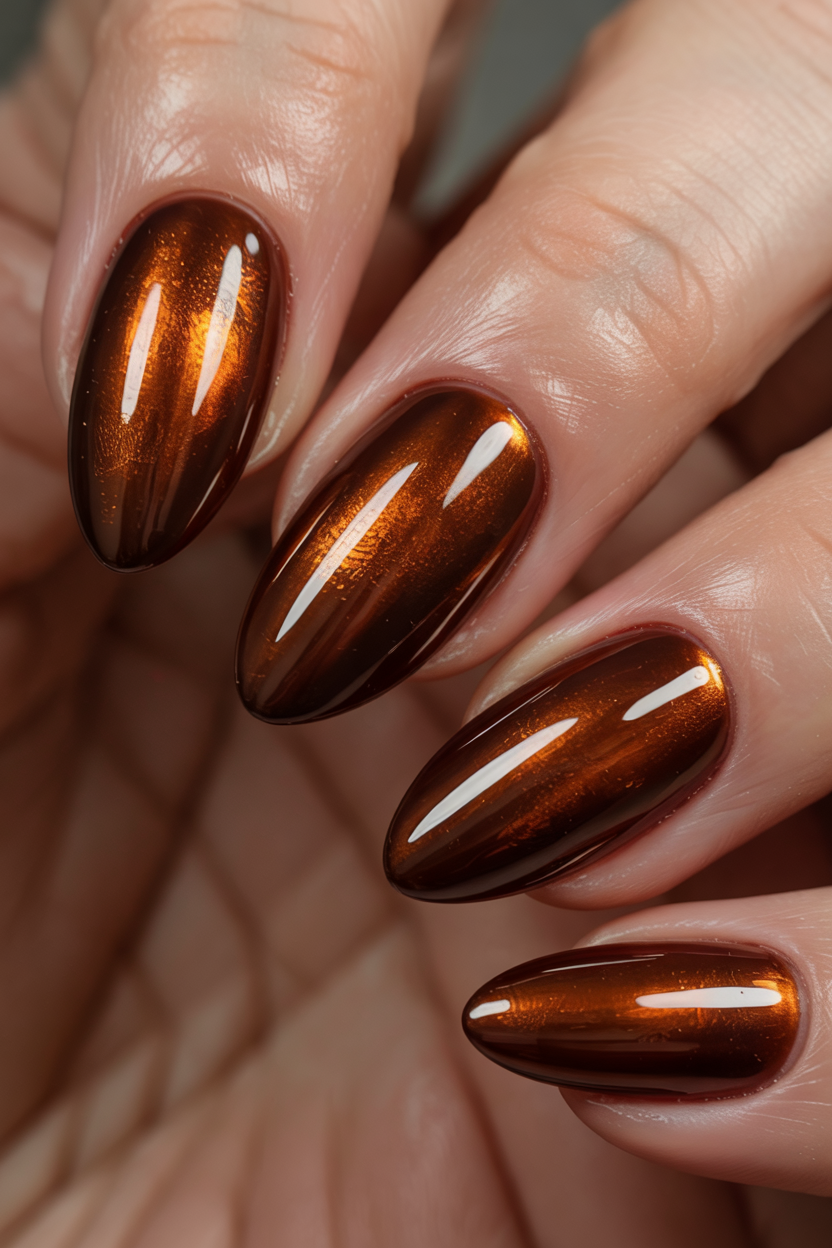 This fall-inspired idea looks stunning on almond nails and complements both warm and neutral skin tones. It’s surprisingly easy to maintain since the metallic hue disguises small chips. Pair it with cozy sweaters, caramel lipstick, or a favorite scarf—your nails will do the talking all season long.