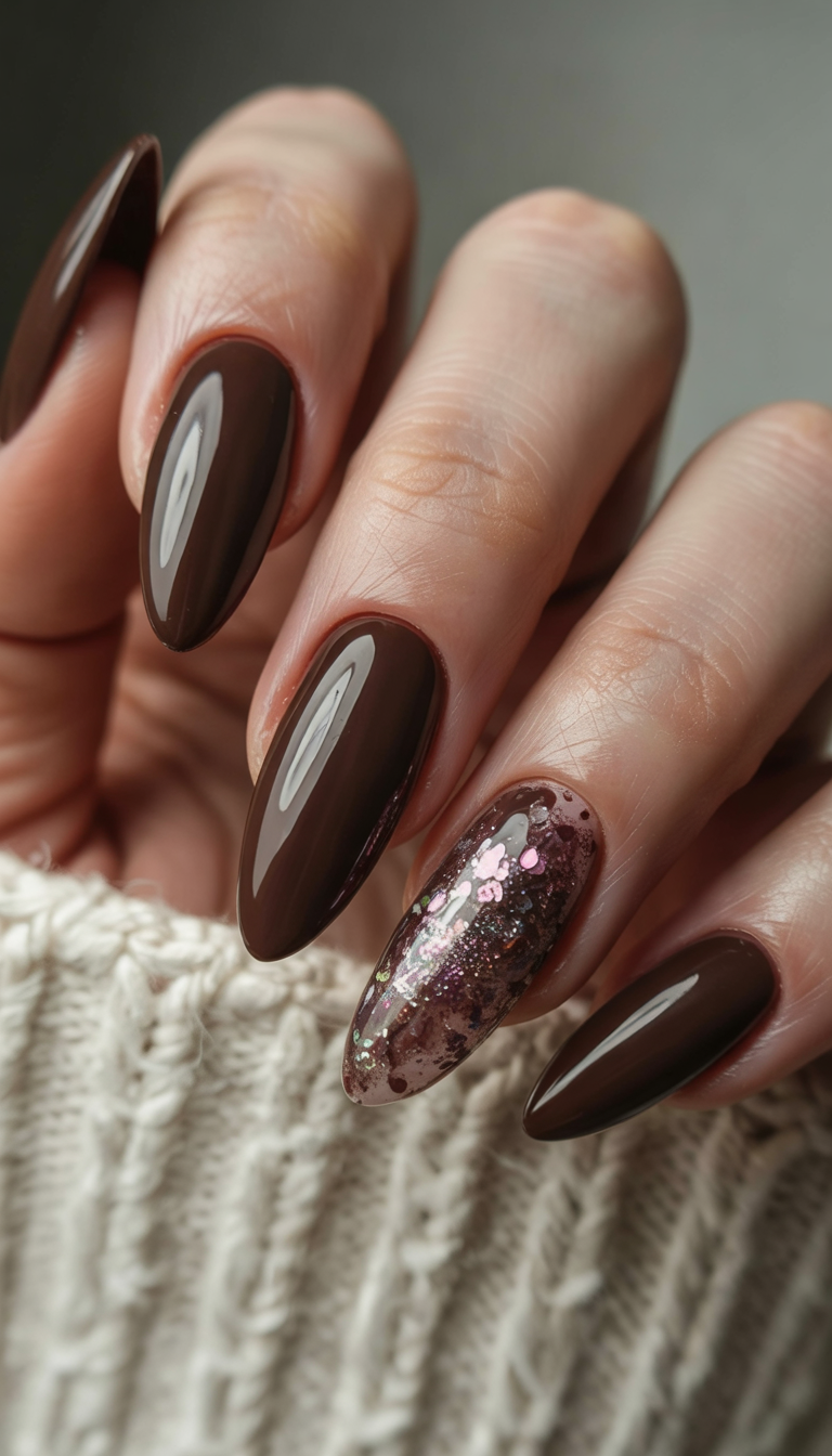 Almond-shaped nails will make your fingers look longer and more elegant. Almond-shaped works well with dark brown. I like that its top is a fun pop of sparkle. I can pair this with a fun lip color and some metallic jewelry.