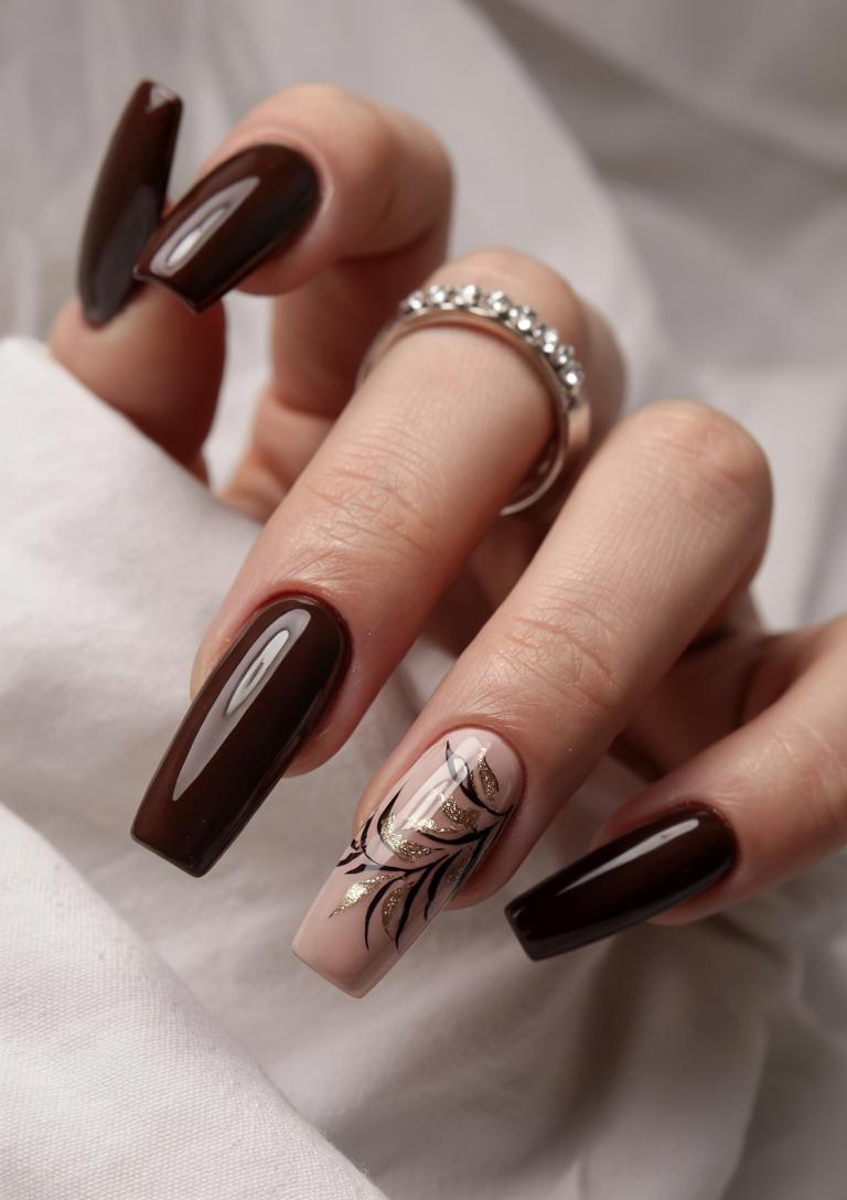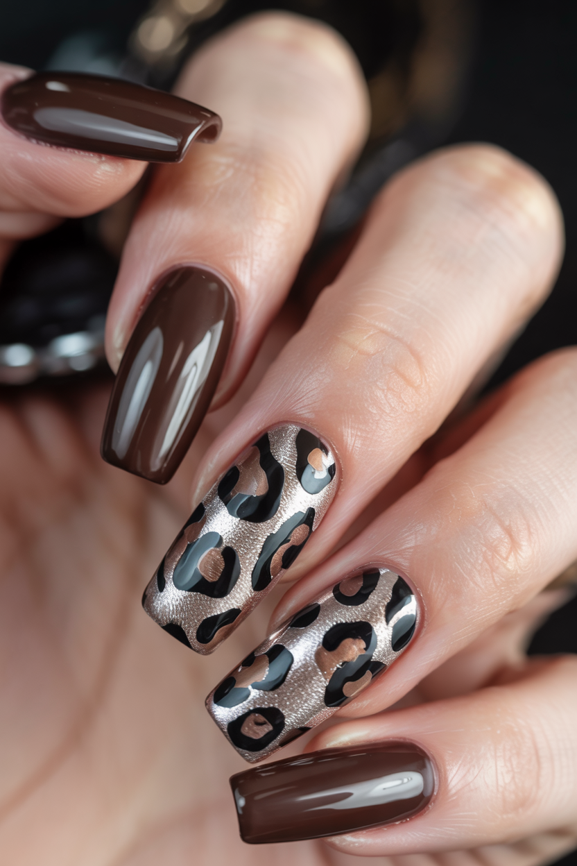 If you’re feeling a bit fierce this season, these dark chocolate nails with bold leopard accents are your go-to. The contrast between the glossy brown base and the metallic animal print creates instant glamour. It’s sultry without being loud—a manicure that says “I’ve arrived,” but in a whisper of sophistication.