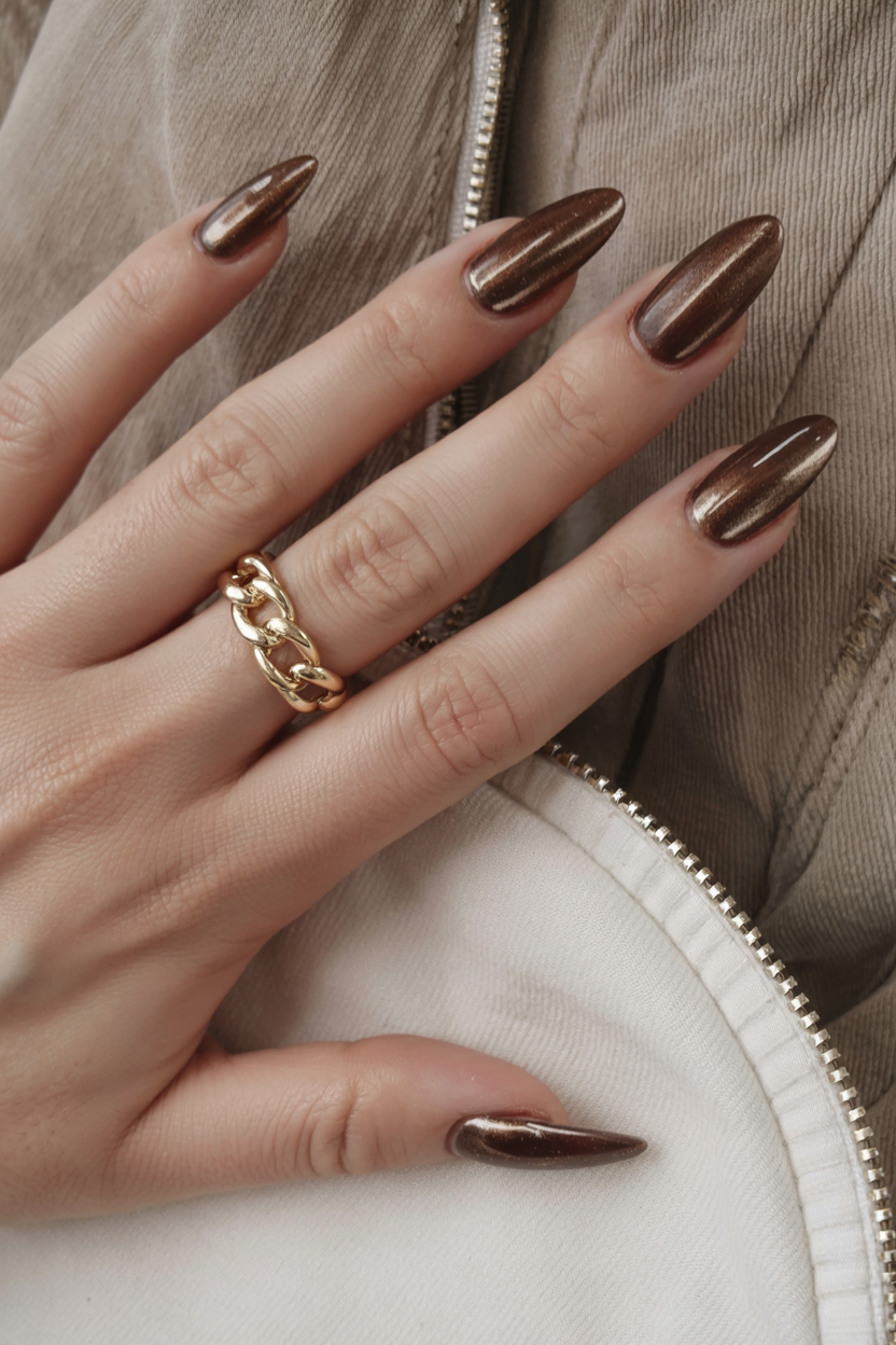 These chocolate and copper tones shine like liquid metal—a chrome dream for anyone who loves warmth with a hint of drama. The glow looks mesmerizing in daylight and even more magical under soft evening light. It’s the kind of manicure that makes you want to gesture more just to show it off.