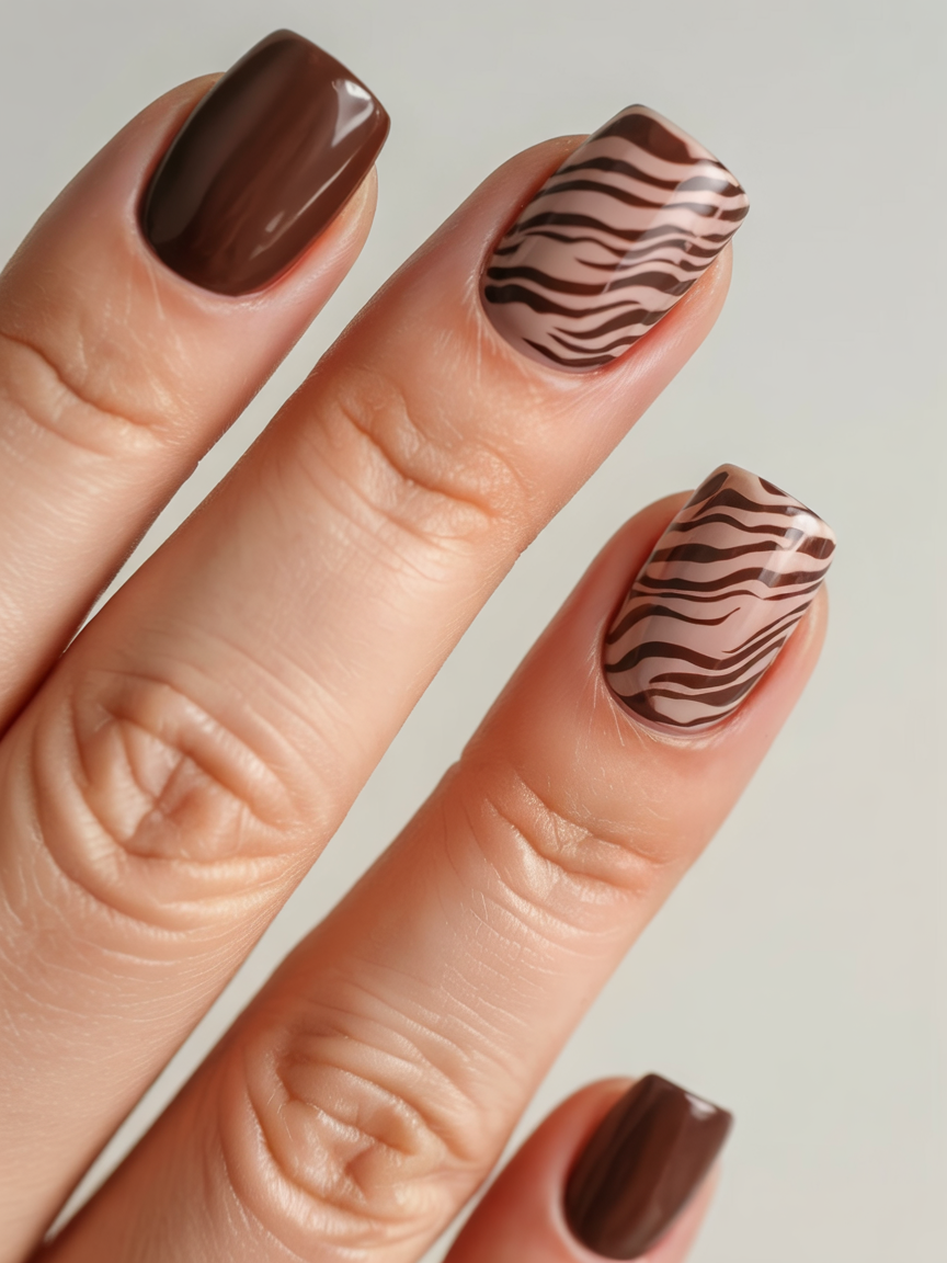 When chocolate meets beige with a playful zebra twist, the result is pure artistry. These nails combine nature-inspired stripes with a smooth glossy base that feels trendy yet timeless. It’s a fresh way to play with patterns while staying in the safe zone of earthy neutrals—perfect for someone who loves subtle edge.