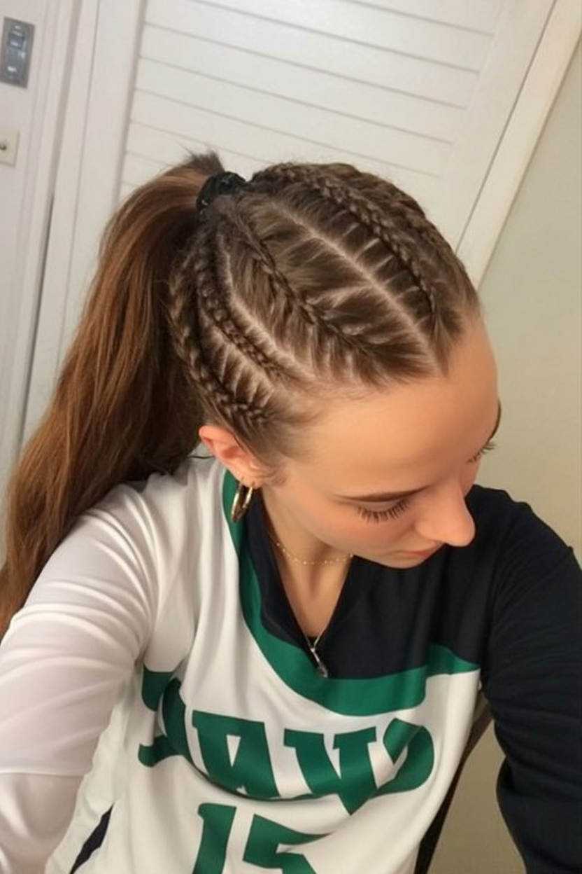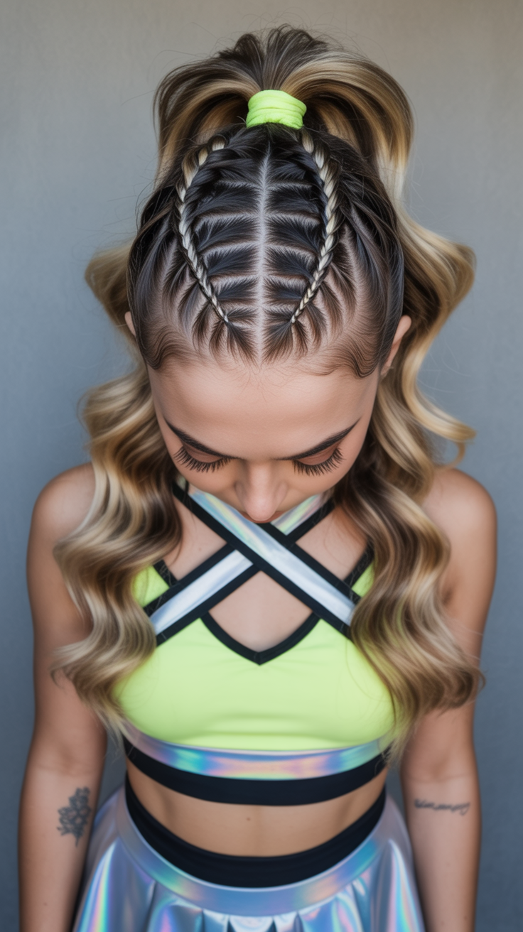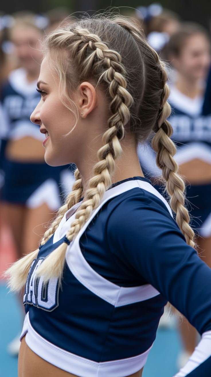 Nothing beats a slick, braided ponytail when you need something both practical and stunning. The precise rows keep the style tidy while giving off that fierce, focused cheerleader energy. It’s sporty, edgy, and a total game day favorite.