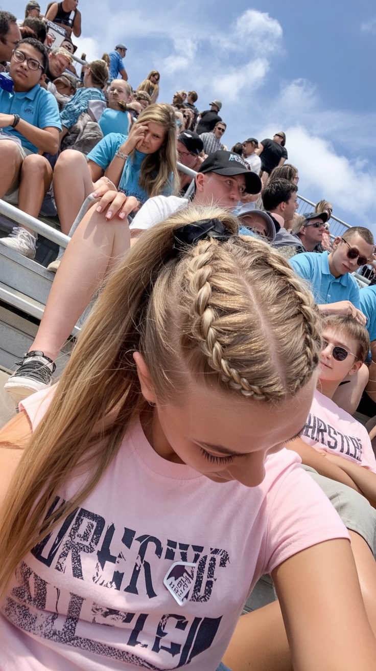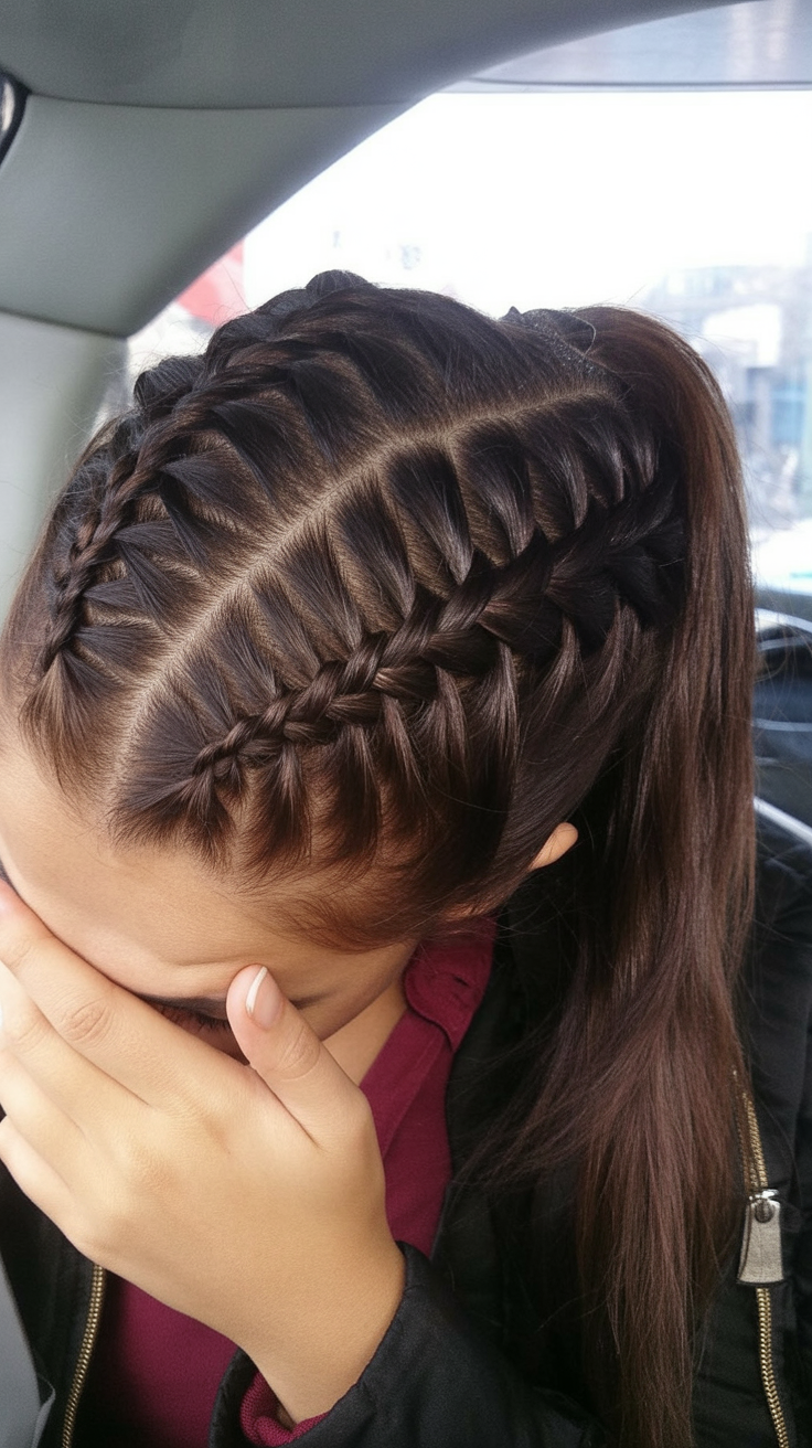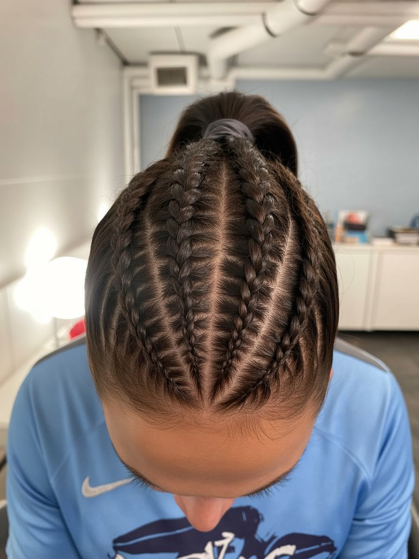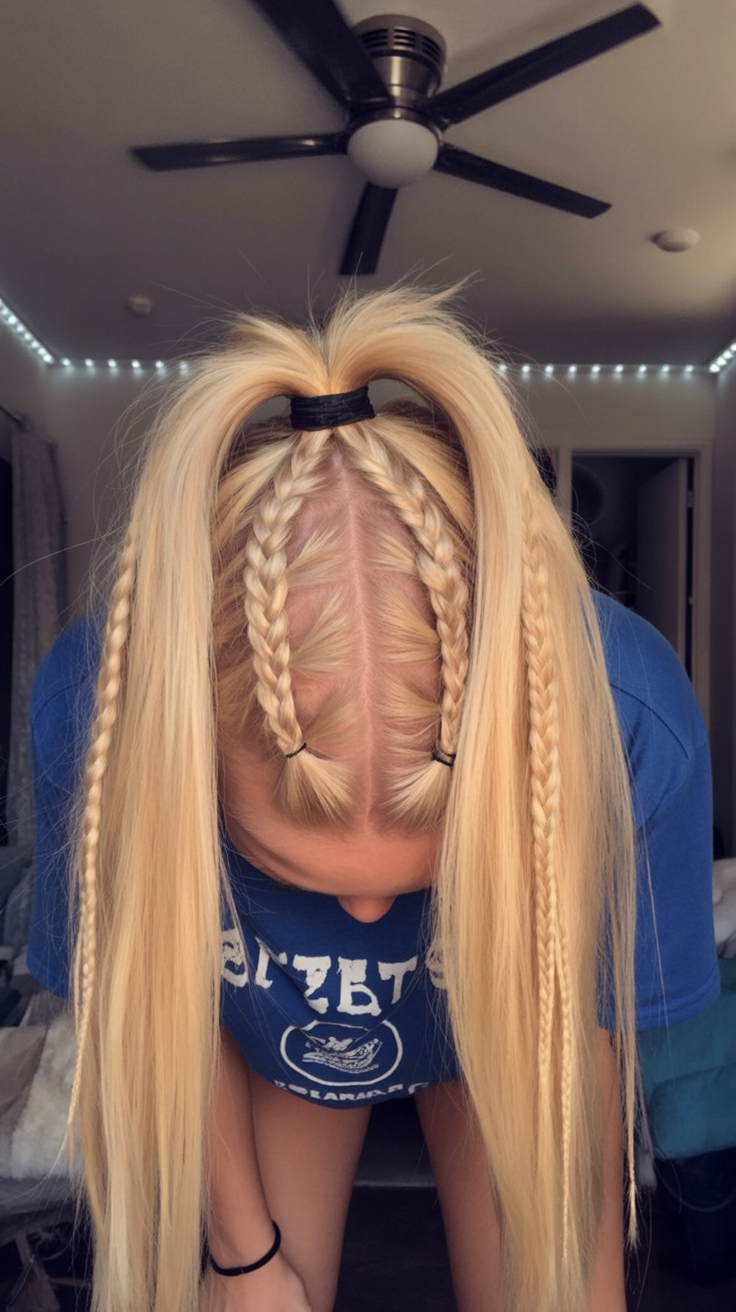 Nothing beats a slick, braided ponytail when you need something both practical and stunning. The precise rows keep the style tidy while giving off that fierce, focused cheerleader energy. It’s sporty, edgy, and a total game day favorite.