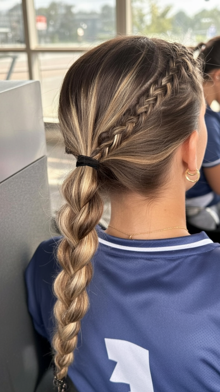There’s something so effortlessly confident about this braided low ponytail—it’s neat, pretty, and full of that sideline-ready energy. The braid adds just the right touch of texture, while the soft highlights catch the light beautifully. It’s a look that says, “I came to shine,” whether it’s game day or a casual school afternoon.