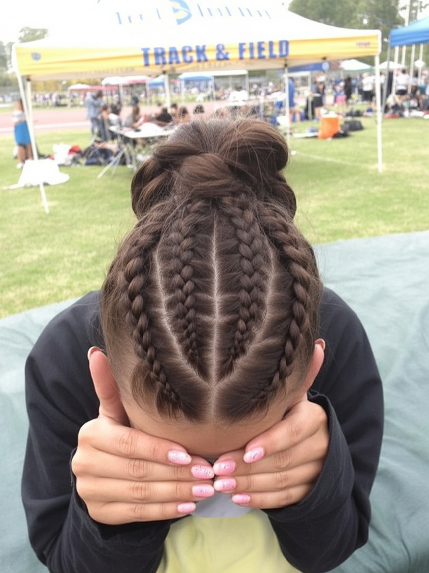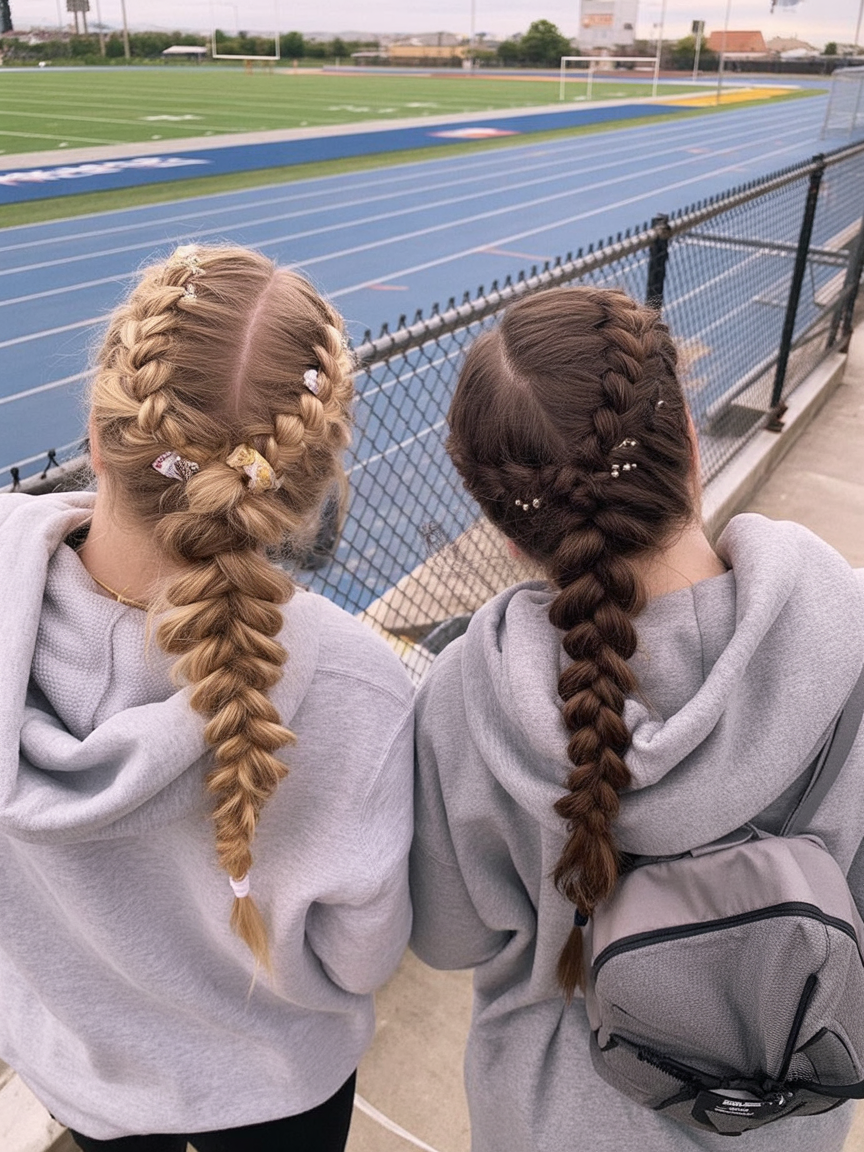 There’s an eternal charm to twin French braided styles that exude athleticism and elegance while being ready to head out on game day. Whether it’s a walk to track events or cheering on from the stands, these braided designs convey unity and strength. They look particularly fantastic with added sparkles or clips hidden away.