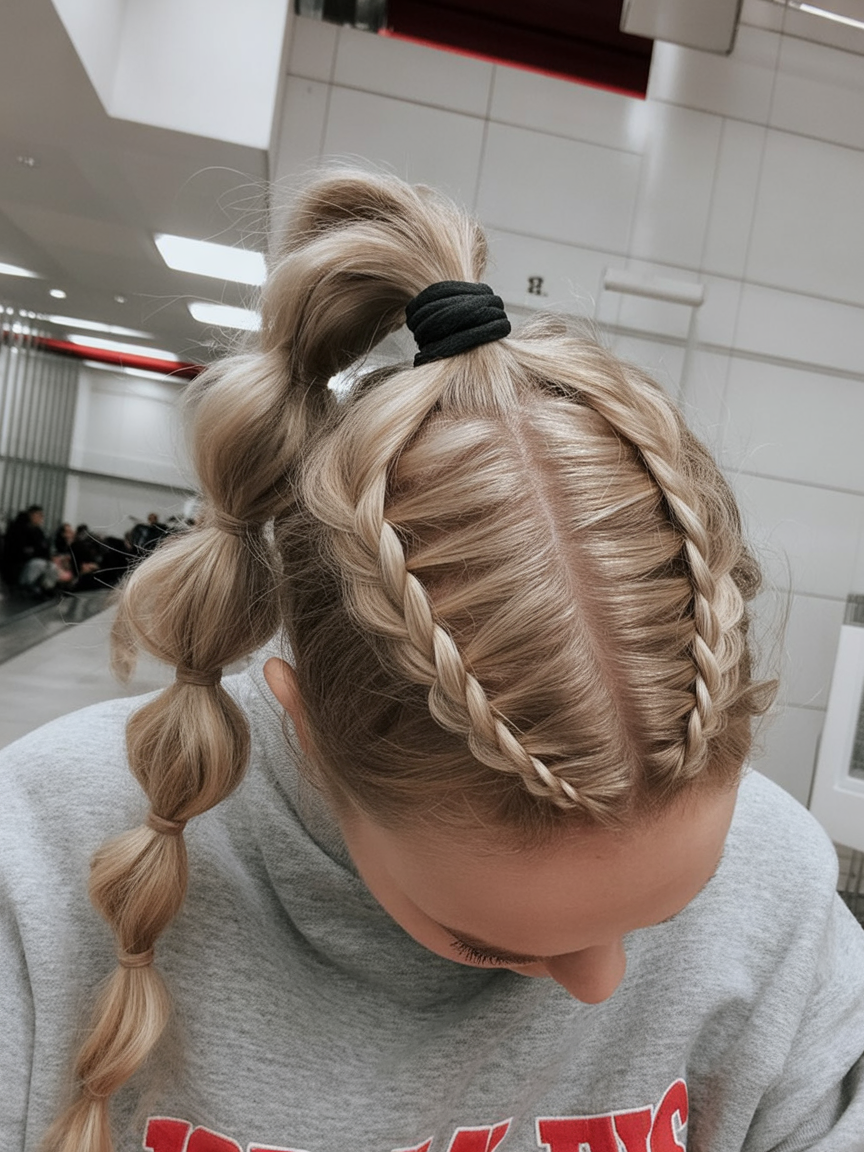 This bubbly, braided ponytail brings all the fun and energy you need for a big day. The thin braid across the top adds a cute, detailed twist before falling into voluminous bubbles down the back—a total cheer favorite that’s both practical and picture-perfect.