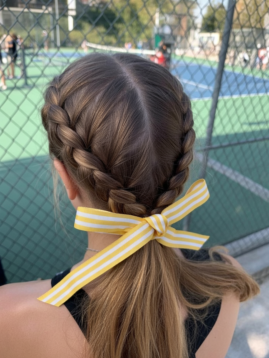 There’s something sweet and nostalgic about this low ponytail with twin braids meeting at the back—finished with a sunny yellow bow that just radiates cheer spirit. It’s simple, polished, and full of charm. Perfect for outdoor games or school events when you want to look cute without trying too hard.