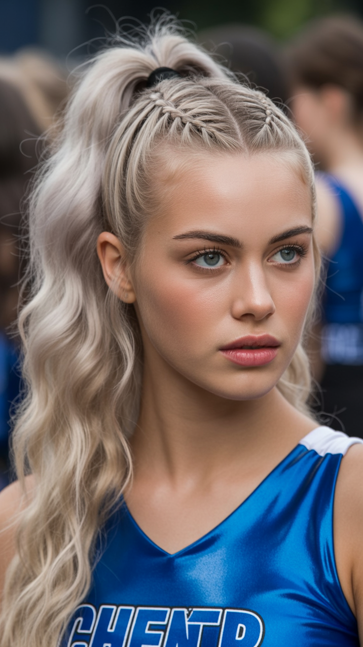 There’s an effortless star quality to this wavy high ponytail. The soft curls flow beautifully, while the braided crown at the top adds a touch of glam and control. It’s that perfect blend of fierce and feminine—made for the kind of cheerleader who owns the floor and knows it.