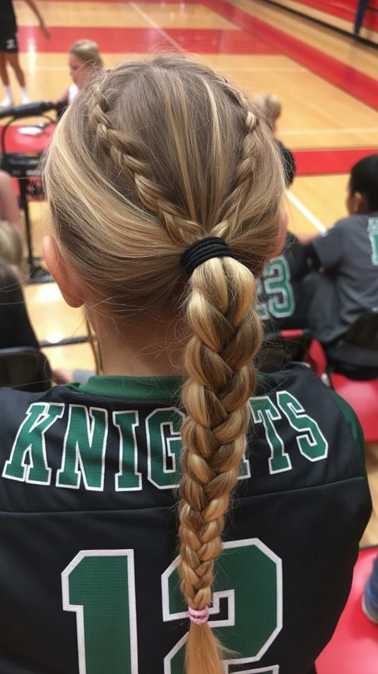 This style works perfectly for medium to long hair and keeps everything secure during football or basketball games. It’s easy to do before practice and stays in place through all the fun. Add bows for pictures or a slicked-back finish if you want that extra touch of polish before competition.
