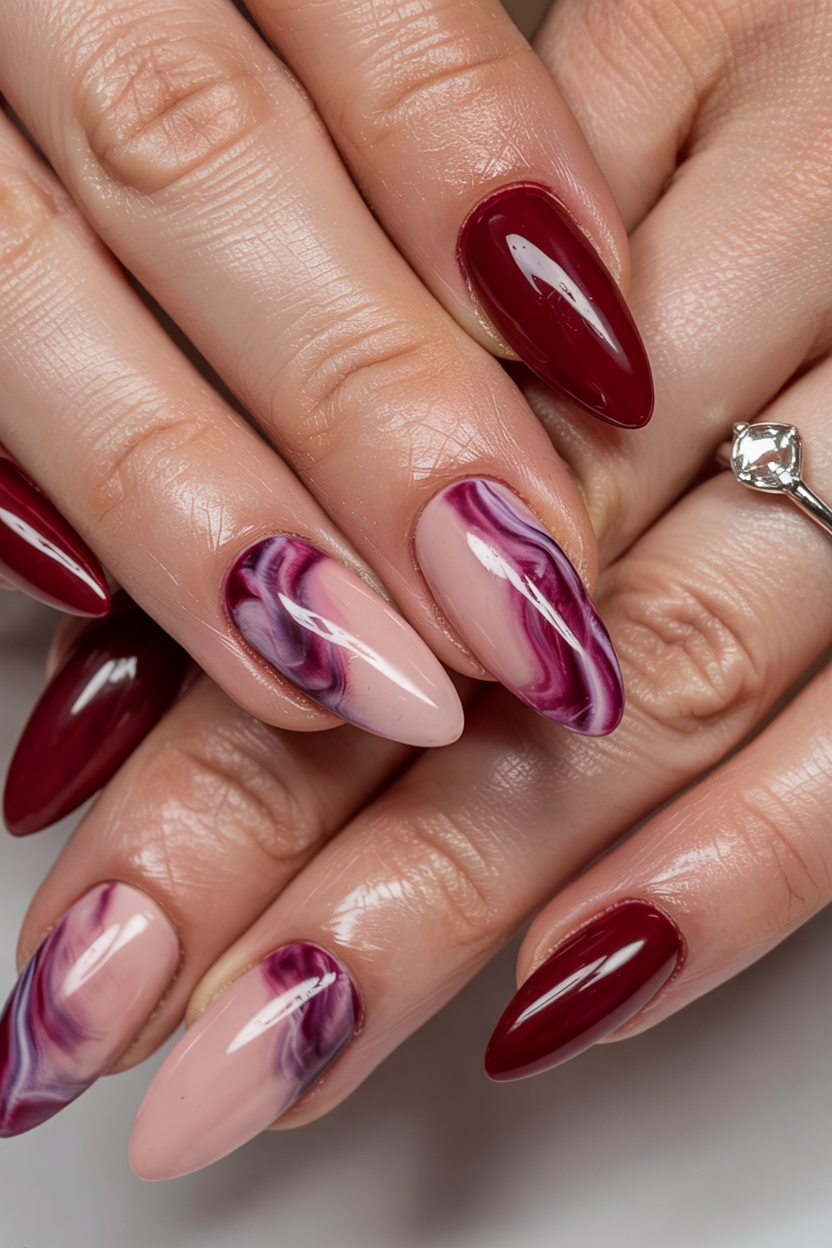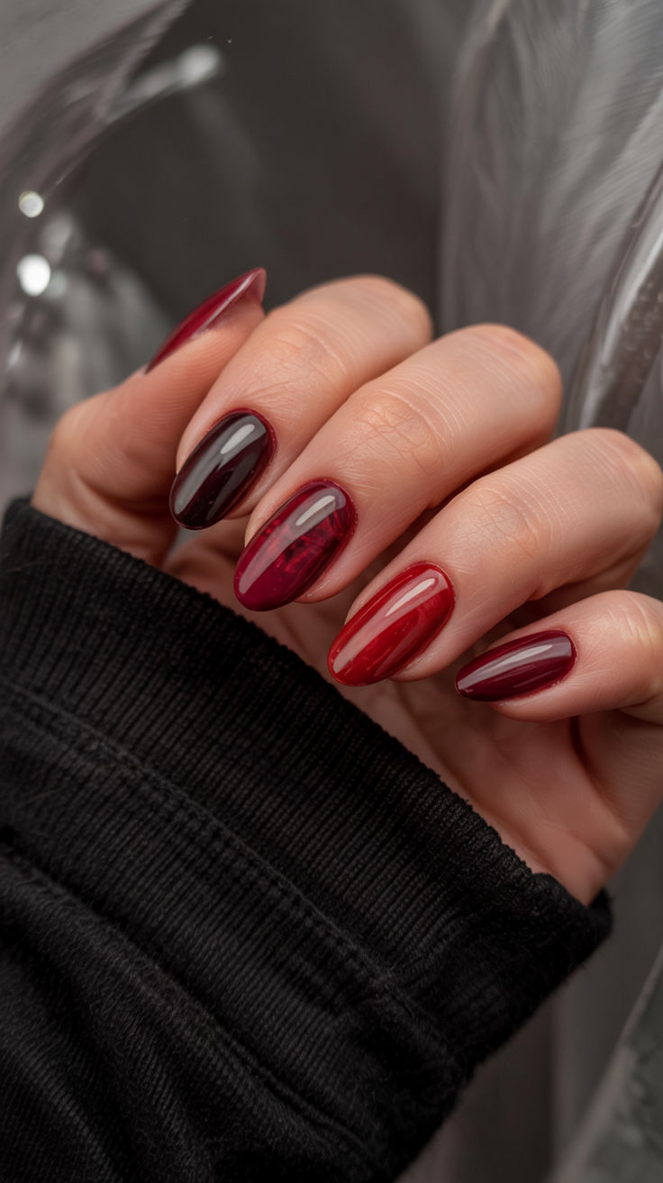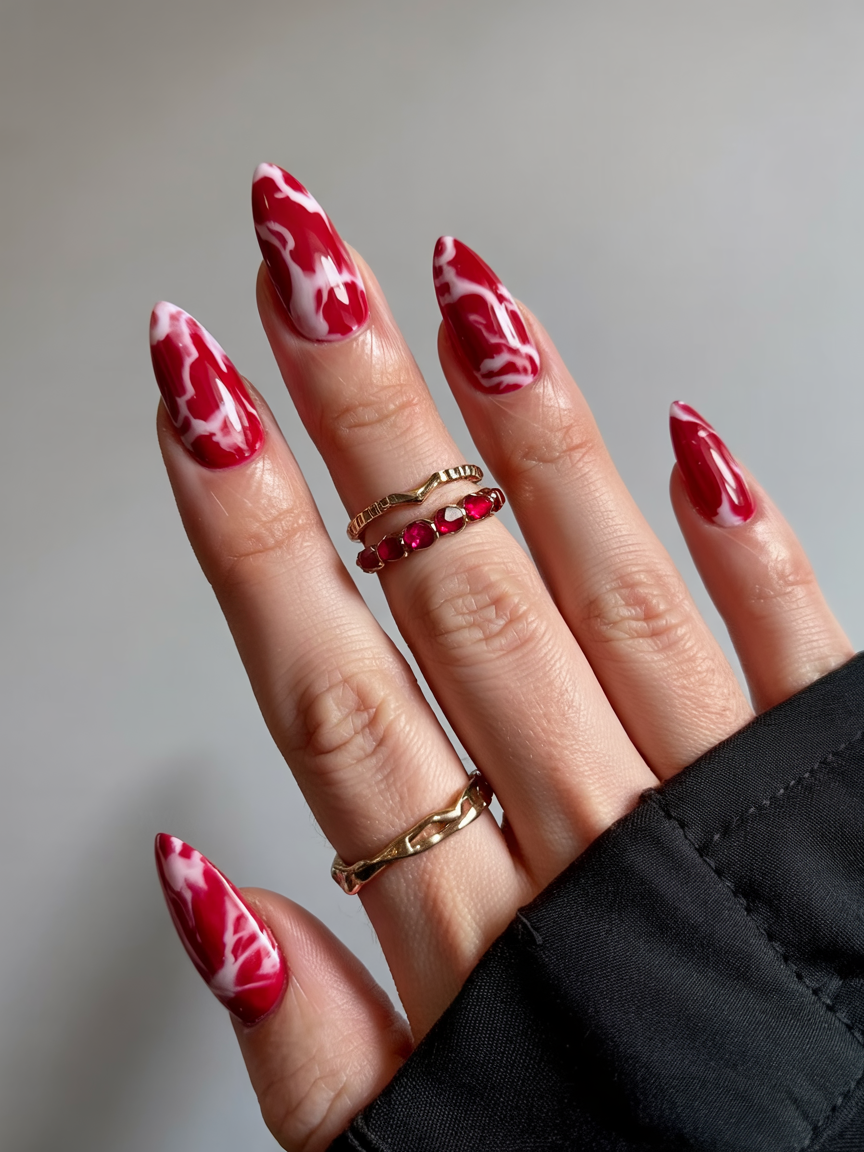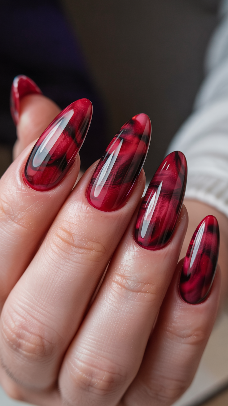 It seems somehow spectacularly sensual about this deeply smoky cherry red nail. Rippled marbled layers of red and black, rippled like velvet curtains in candle light–much too moody and mysterious to be forgotten. It is this type of manicure, which lets you know of classiness with a touch of edge once in a trench coat, oversized sunnies and bold red lipstick.