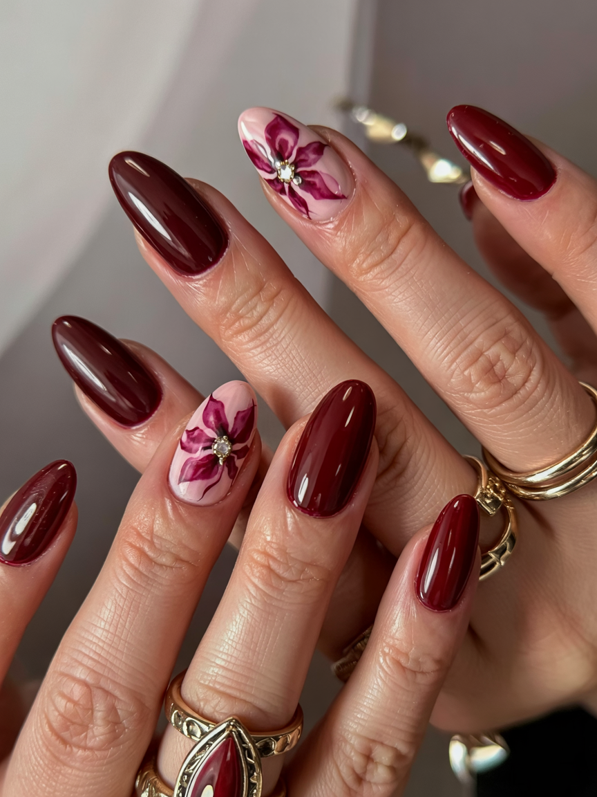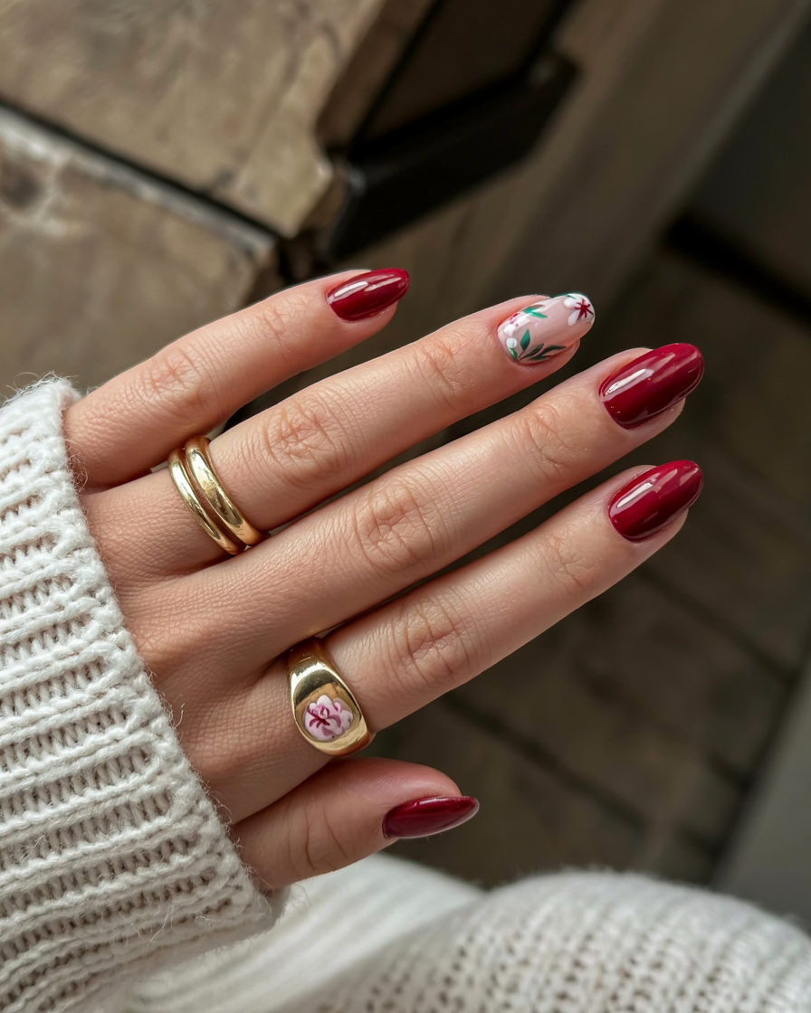 Red done a little bit differently–this mani will remind you to remember that the beauty is in the little things. A flirty flower on the accent nail is just what is needed to make an otherwise elegant, solid cherry red base look fresh and young. It suits a lady who is earthy yet at the same time enjoys the little twinkle in creativity.