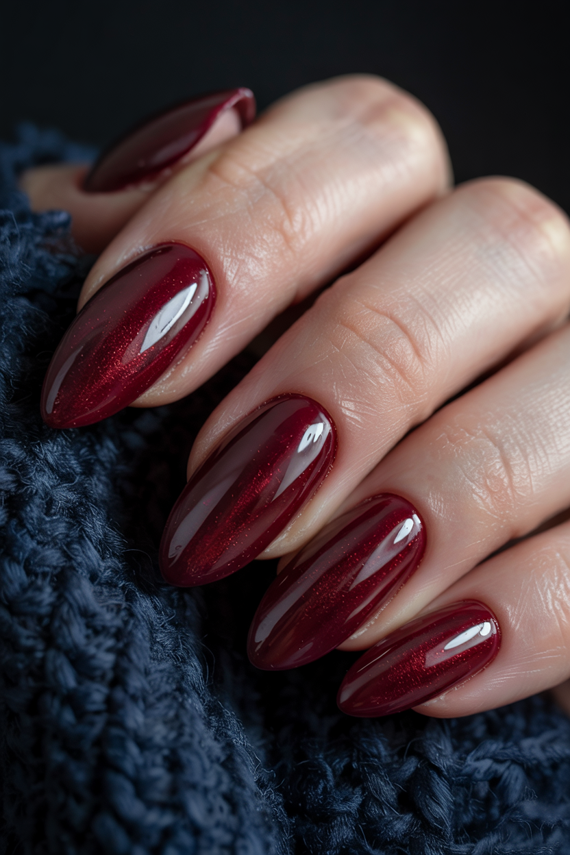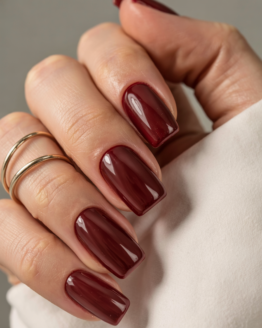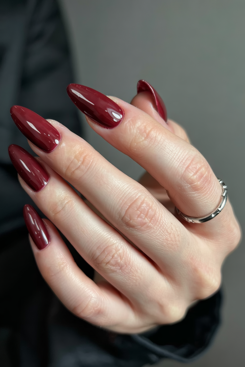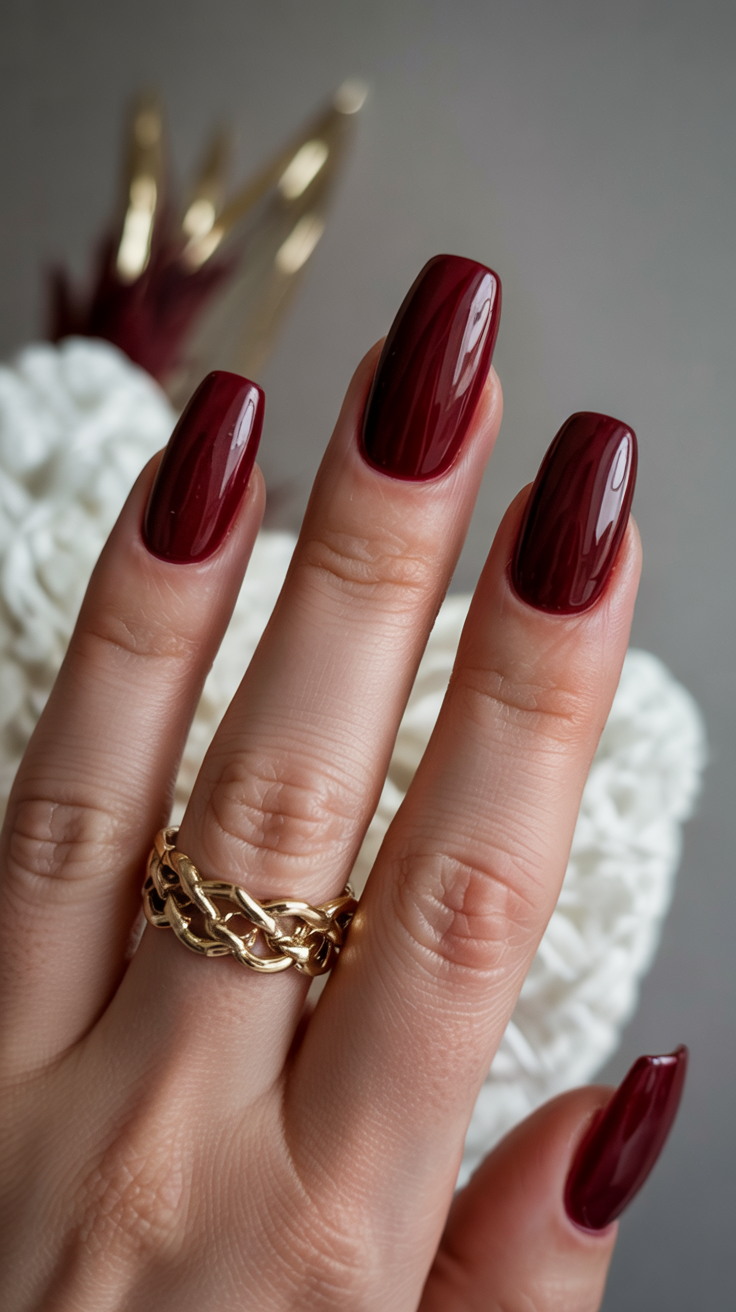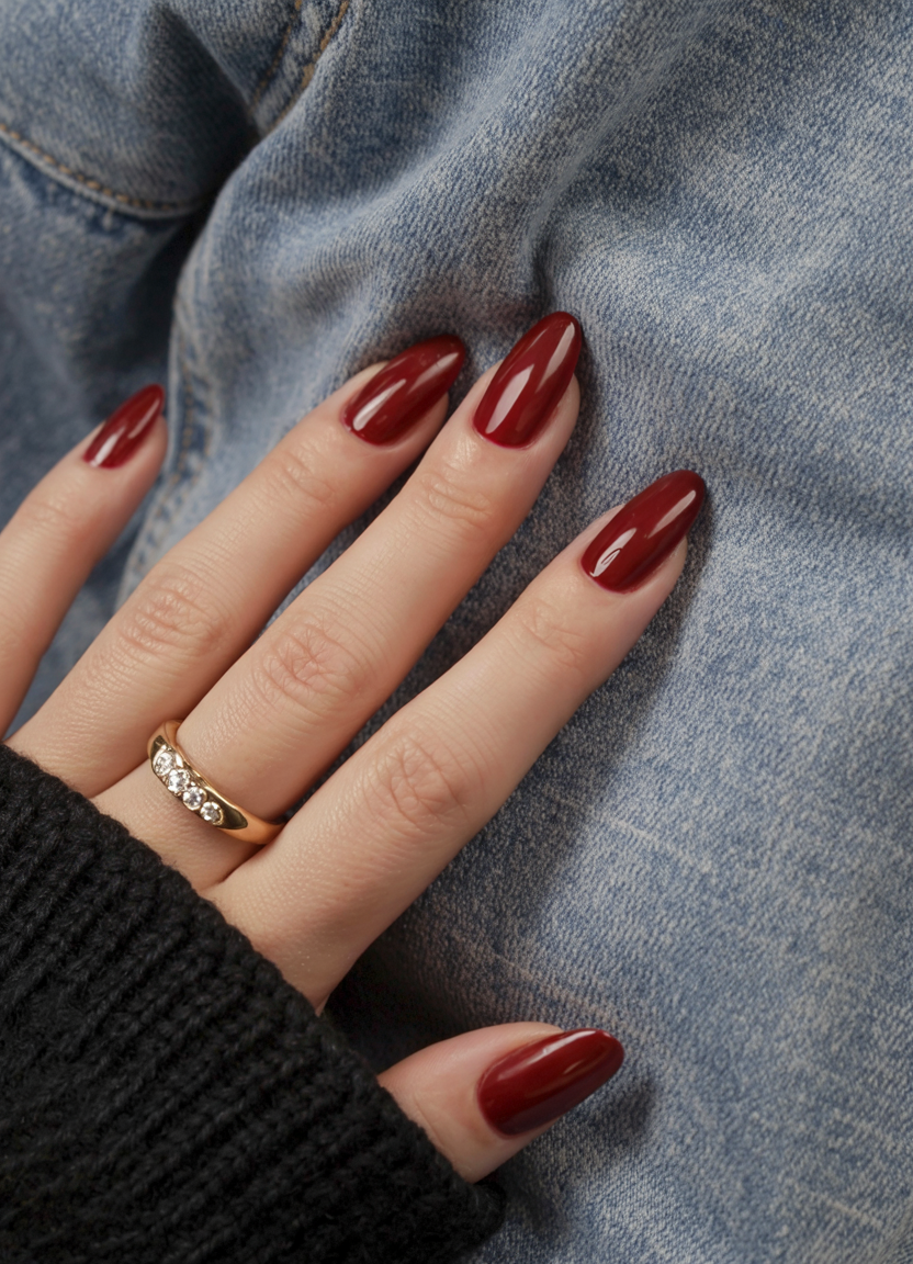 A cherry red is velvety and deep, which has a way of making stuff look more polished. There’s an effortless chic to these nails—no glitter, no embellishments, just rich, saturated color that whispers confidence and class.