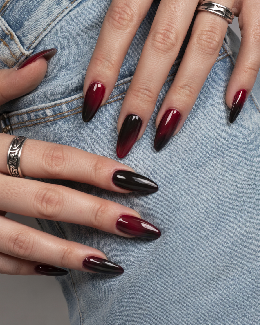 Provided you have naturally tough nails, or have acrylic extensions, this almond shaped figure complements this shape well. It is a gently graduated colour and a low-key trifle to the chrome craze without requiring metallics, just right should you prefer dramatic, but not shiny. Apply the fade with a sponge or soak it up on the nail tech to that perfect smoky finish.