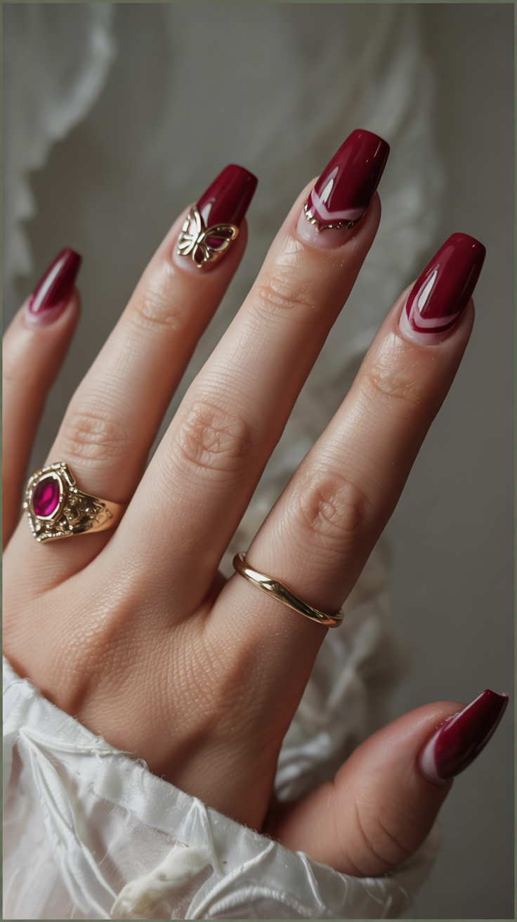 The square nail, in the hue of cherry, already seems like a fairytale, with that small butterfly charm, pinching it all looks like your manicure just flew out of a dream in the garden. The design is somehow delicate and yet playful, yet at the same time polished such that the smallest amount of sparkle makes you smile each time you glance down.