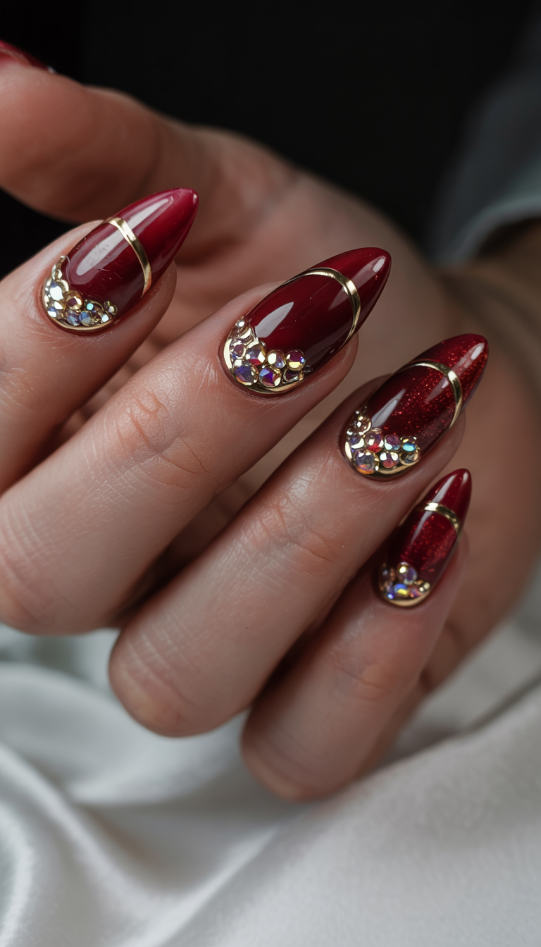 Now this is cherry red done glamorously right. Glamorous, couture-like effect comes as the result of combination of deep red nail polish and golden embellishment with sparkly gemstones. It is drama, but the polite type–such as drinking champagne in a silk robe.