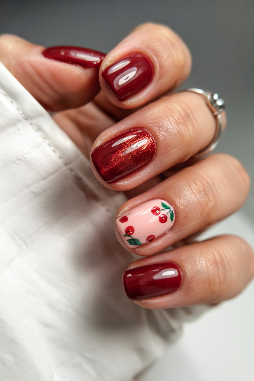 There’s something magical about a manicure that reveals its shimmer only when the light hits just right. It is a barely-there glitter that makes these cherry nails have just a hint of shimmer- similar to how you would feel about your favorite red lipstick with a satin finish.
