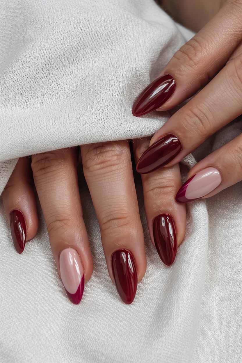 This gorgeous assortment of deep cherry red and rosy pink is sophistication meets flirtation. The diagonal French tip adds energetic edge to the almond shape, and adding a contrast creamy nude and aggressive red berry balances the look to being modern without it being excessive.