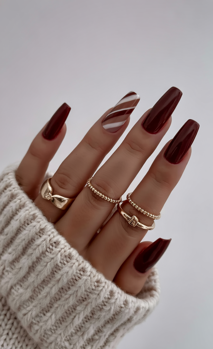 A little whimsy never hurt anyone! This candy-cane candy stripe on thick red nails makes a witty seasonal statement without ever straying into kitschy. It is light-hearted yet mature-ish- similar to peppermint bark at a holiday cocktail party.