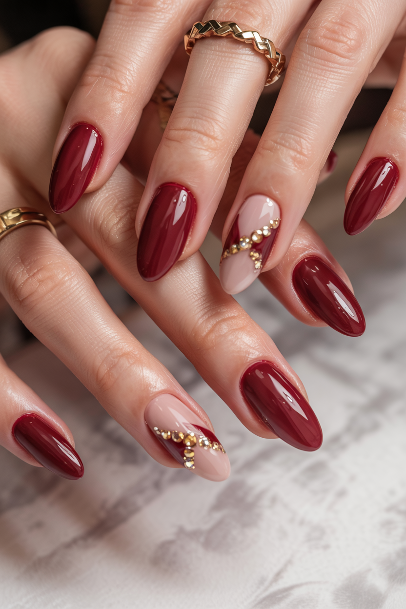 This set of cherry red nails knows how to play: she has a glass of red wine in one hand and invitation to the holiday party in the other. The gold studded diagonal accents have a luxurious flair which elevated the look of the whole instantly. It does not look gaudy, yet somehow manages to be glamorous, and can be worn both to an elegant dinner out or a glamorous brunch.