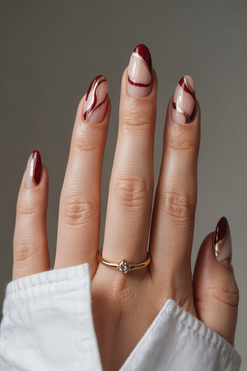 This inspo almond design works wonders on naturally long nails or overlays, and the transparent base means it’s incredibly forgiving as it grows out. And the combination of the bright red and subdued gold lines perfectly falls within the inspirational type of design in 2025, which is an understatement of elegant style. Pro tip: it goes with gold hoops and your kissed lips favorite tinted lip balm.