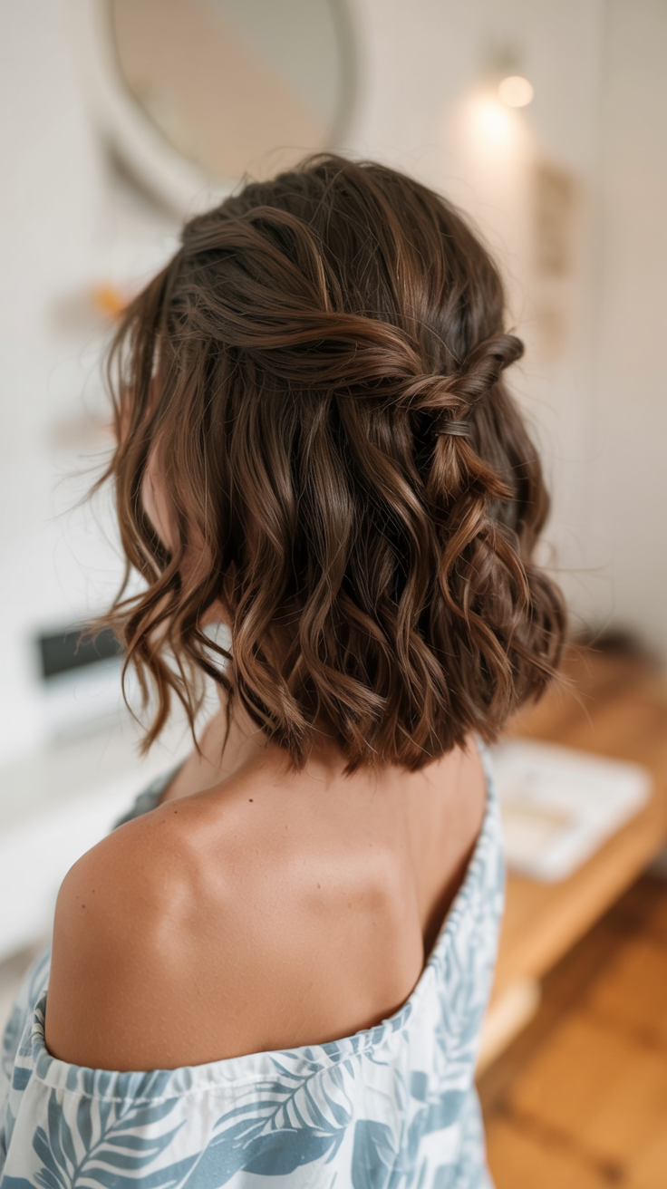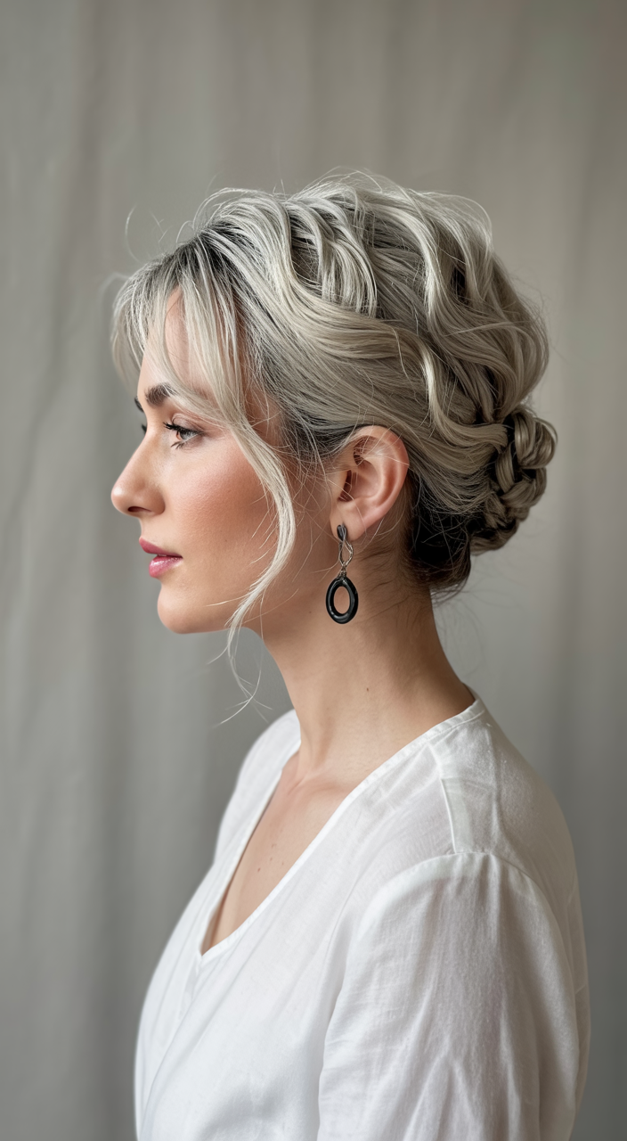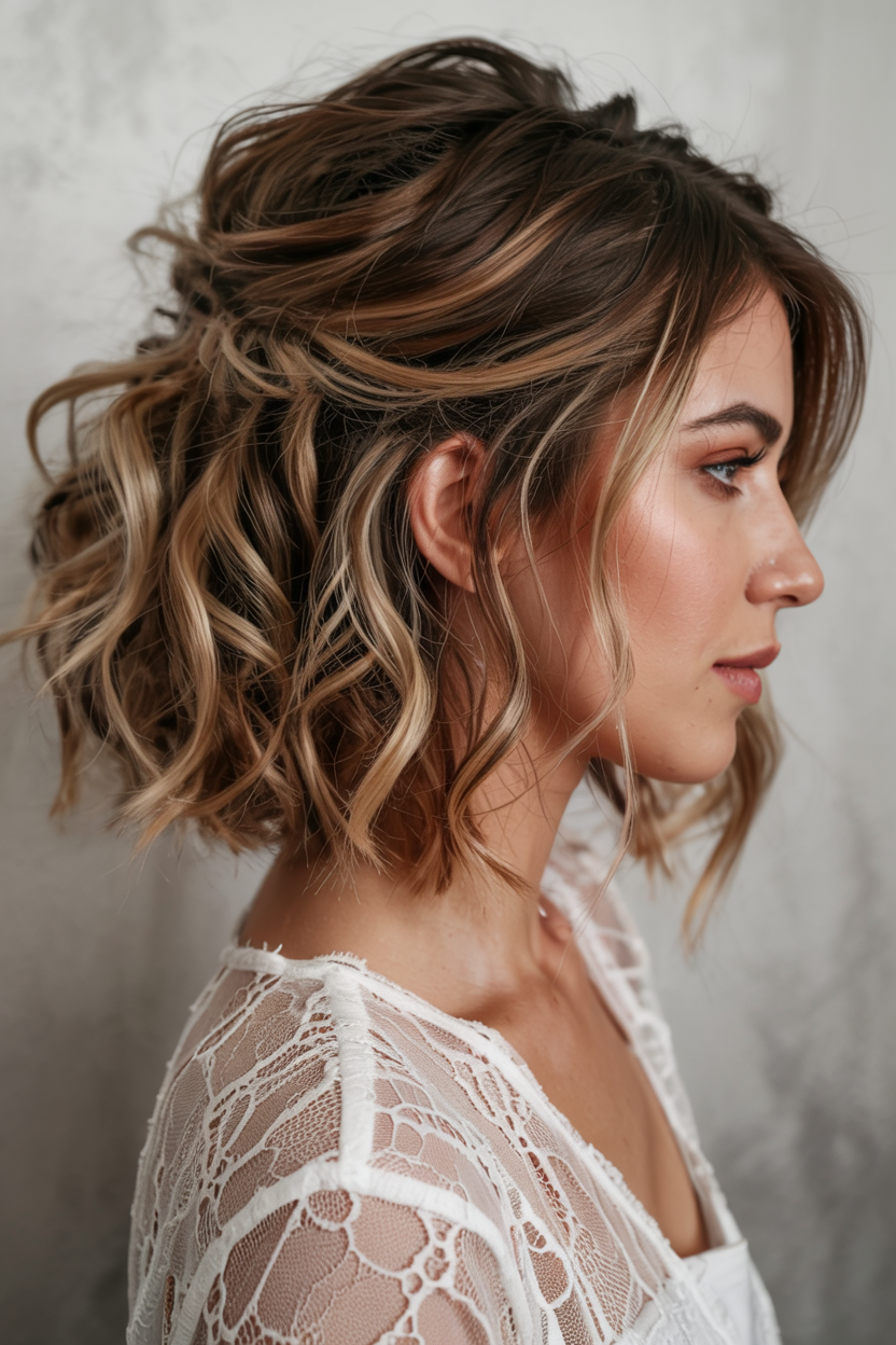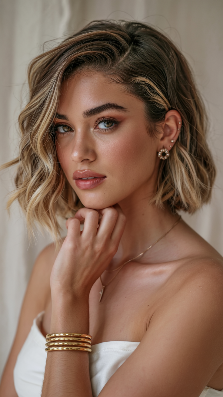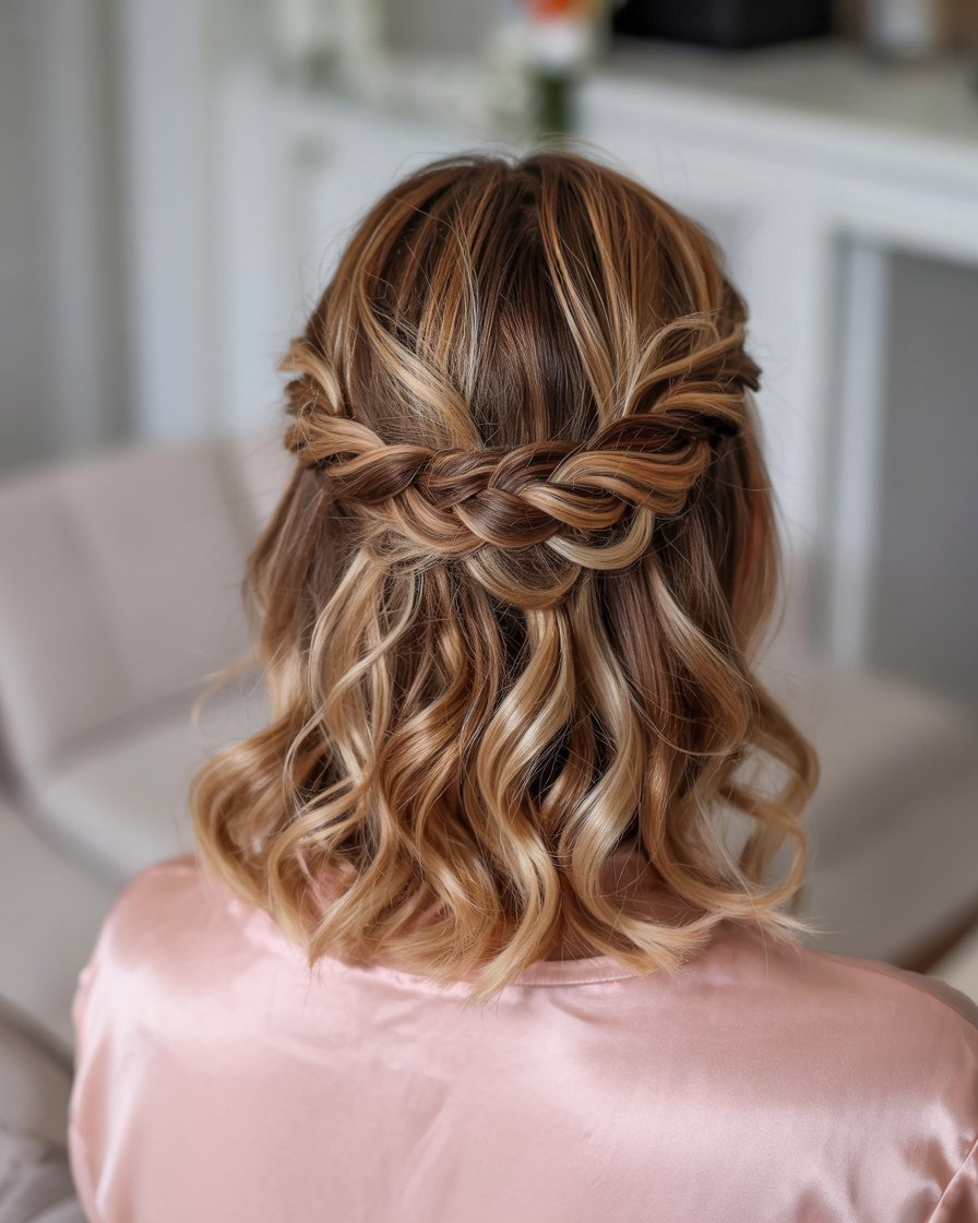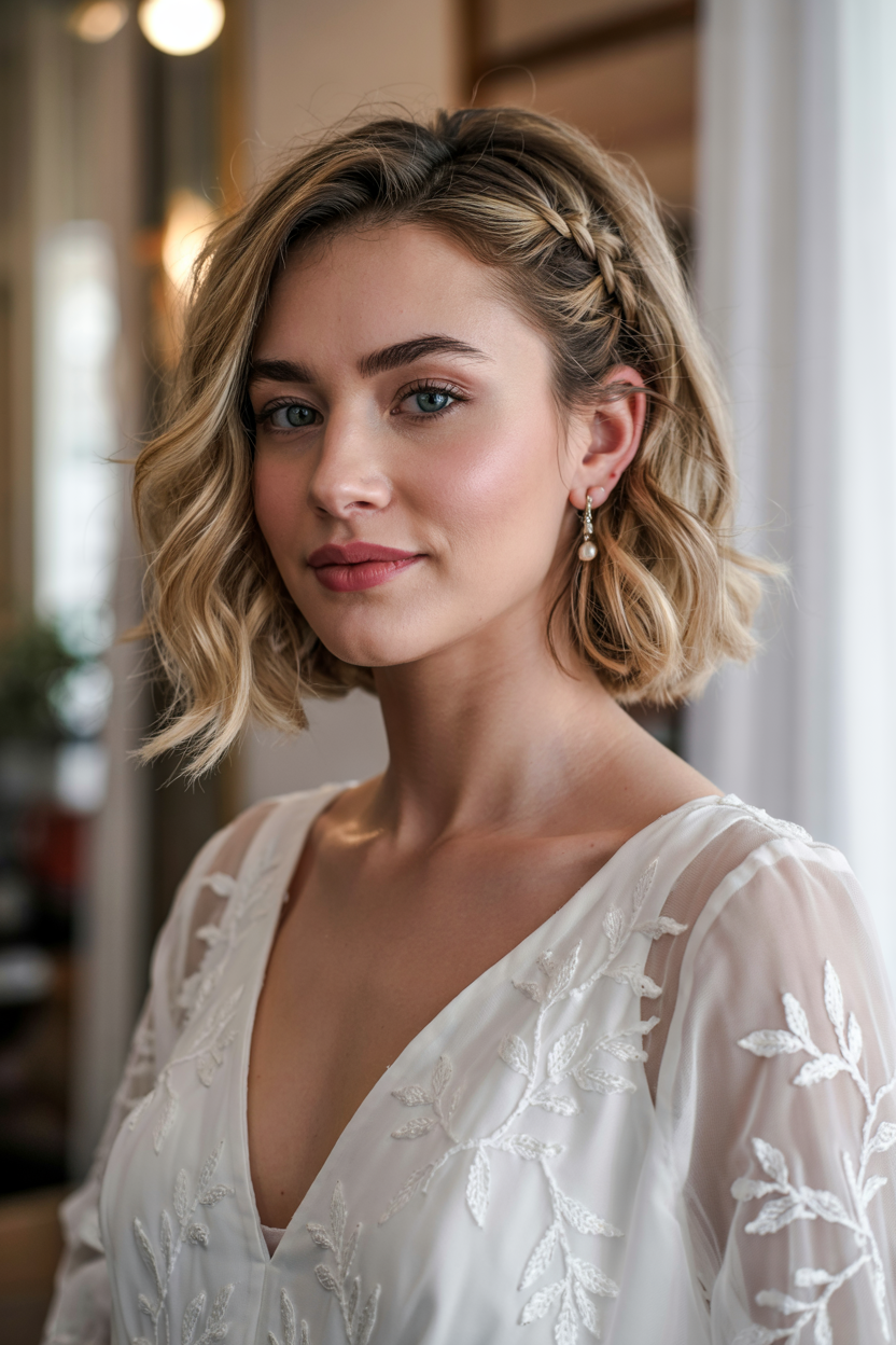 Adding a braided crown to any haircut automatically gives it the most beautiful storybook quality—soft, feminine, and very detailed in terms of styling without being tiresome to execute or overly dramatic to enhance one’s features or face. The subtle curves in the bobbing haircut give it lots of lightness and radiance in the features, while the braided crown centers it all with the functionality of a beautiful accessory on one’s crown locks. Textures with definition are where it’s at right now, and this look hits that perfect 2026 mark: not so polished it looks done to death, not so undone it resembles a bird’s nest—but perfectly natural, touchable, gorgeous glam. Perfect for wedding guest styling, bridesmaid hairstyles, and even short hairstyles for wedding events where you love the look of glamorous without feeling like you’re trying or done-up.