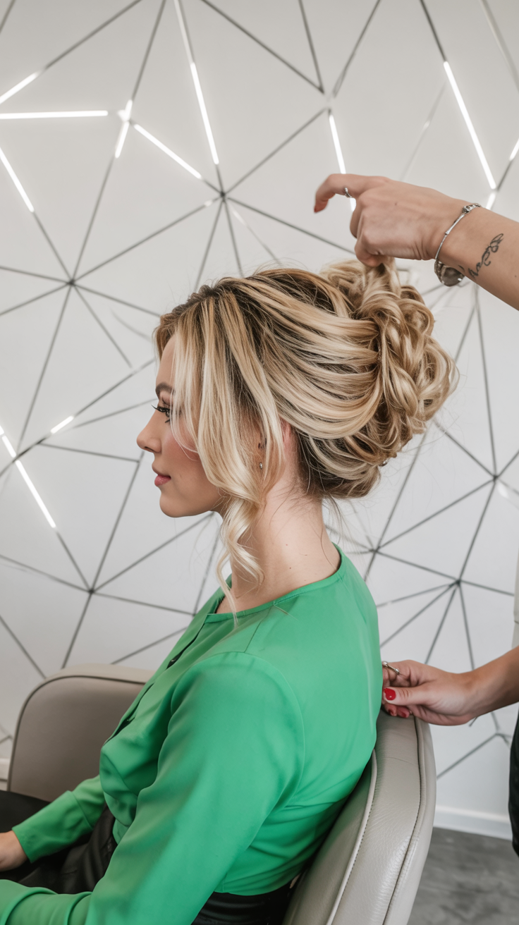 There is something retro-beautiful about this curly chignon—almost something of a contemporary fairytale quality to it, so lovely and so mystical is it just to imagine it on you. The relaxed waves, the subtle lift, and the soft wisps framing the face weave together to tell you a story of beautiful upliftedness—you feel young and full of light, with nothing but the best days in the world ahead of you, walking through the garden of the venue no less, or meeting besties for dinner at sunset. If you’re looking for a look that gives you confidence and poise, trust me: this one is a winner. The locks look stunning in an evening setting and are absolutely perfect for an effortless wedding or wedding guest hairstyles in particular! For fine and medium hair, mousse has been added to hold waves in place before being secured with pins for long-lasting hold and strong root lift. Completed with shimmer spray and cute earrings, the look rocks completely in the most lovely and discreet manner.