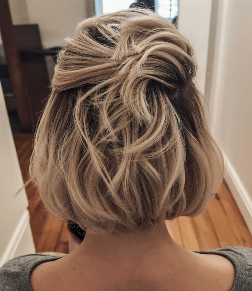 If you’re looking for a look that perfectly goes from being professional to ready for a night out on the town, trust me, this one is a winner. Begin with volume spray, lightly tease the roots, and loosely secure with pinned curls to maintain volume. Ideal for work hairstyles with short hair, easily transformed in an instant to prom hairstyles or wedding hairstyles—one look, and an endless supply of compliments coming in each direction!