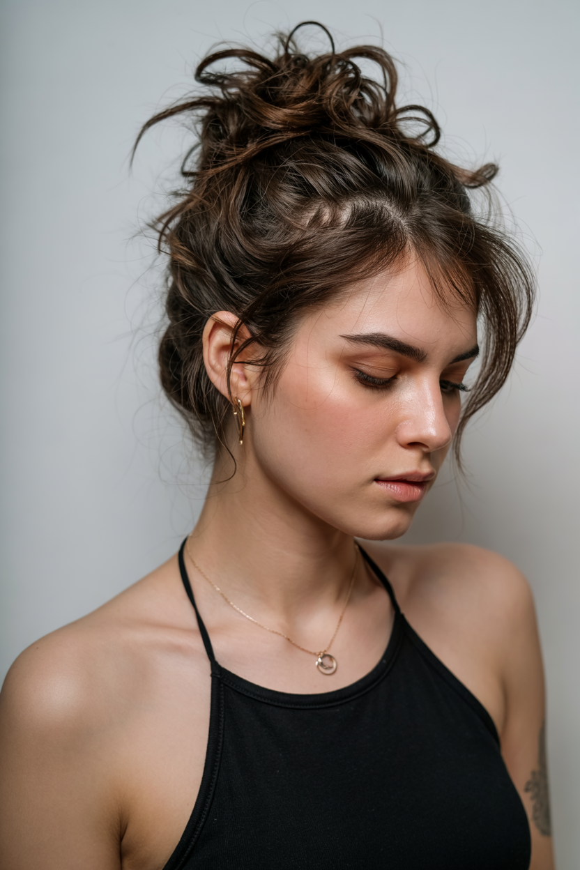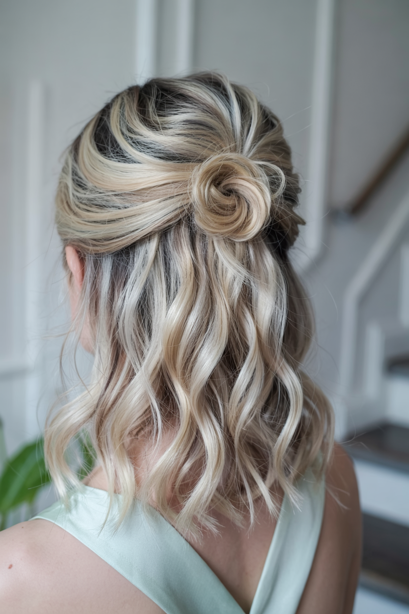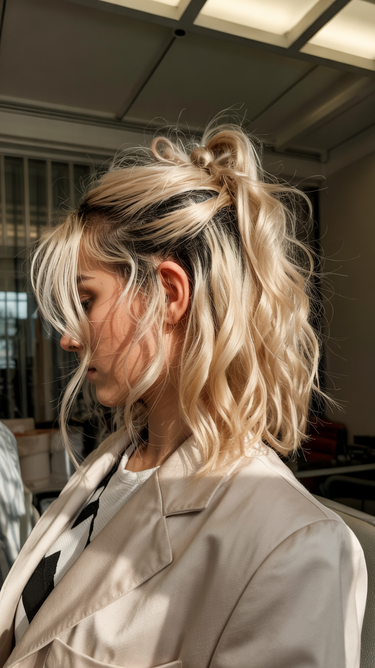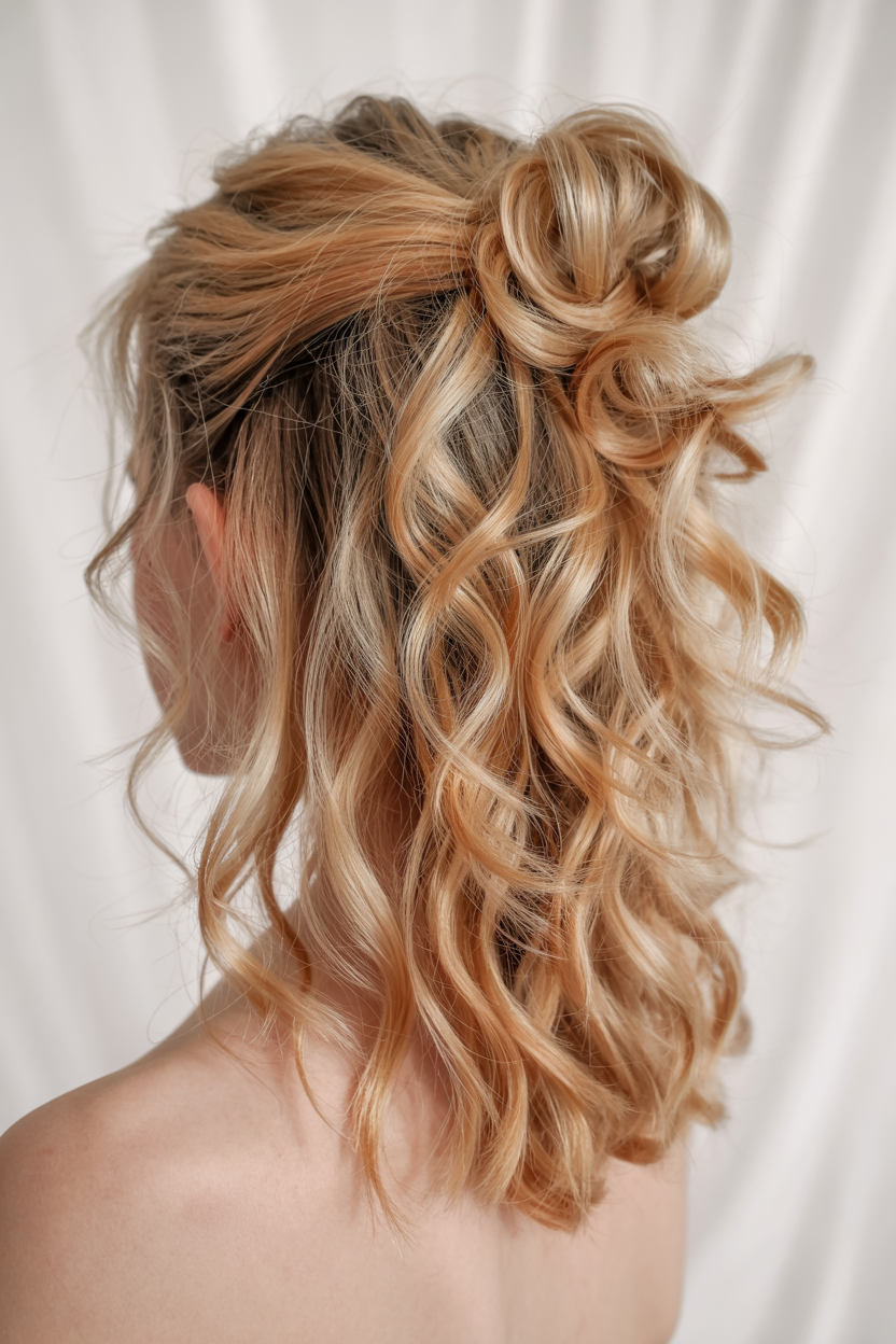 There’s a playful spark to this undone half-up bun—that effortless “I just tossed my hair up, and look how cute it turned out” moment. Loose waves and airy tendrils create movement that feels youthful and spirited, while the mini bun brings the drama right up top. It’s casual chic with just enough flirtiness to make the whole look feel alive.
