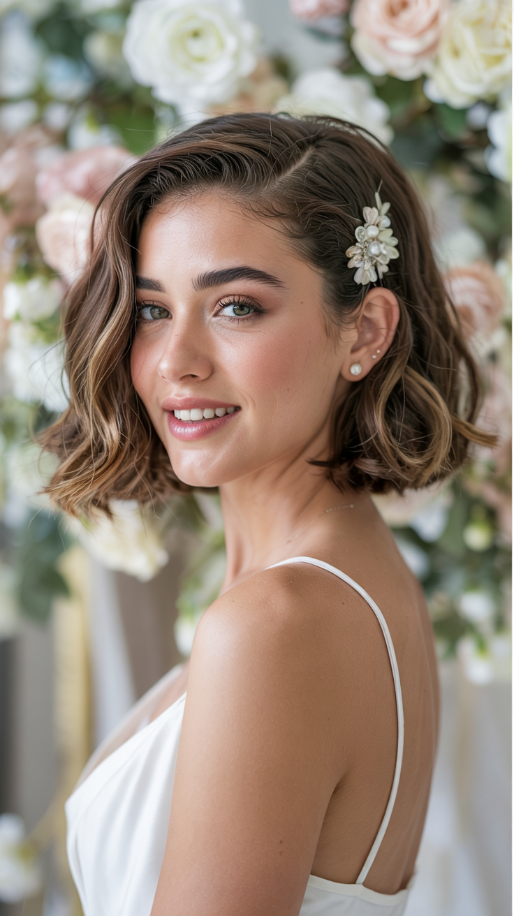 There is something so light and beautiful about the side-swept, curly bob with the pearl clip: it gives off so many different elements—delicateness, radiance, and sun-kissed waves that start in the right place, while even the curves around the face glow with an entirely natural luminosity. This look can be perfectly paired with soft blush, pearl earrings, and subtle highlighting for a radiant finish. Whether you’re incorporating wedding hairstyles, prom hairstyles, or short hairstyles with work hairstyles that instantly appear fashionable in seconds, you can opt for one that gives you instant sophistication. This works perfectly with fine hair because the side part with the clip creates effortless lift and definition without any hassle.
