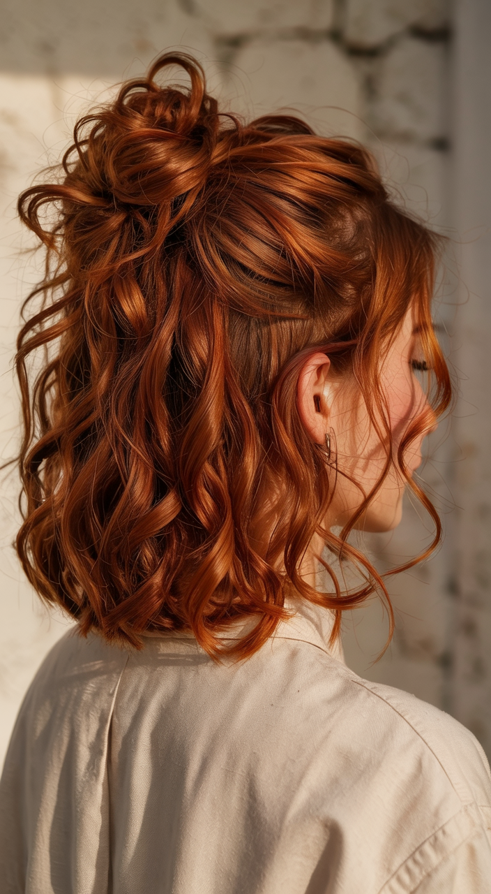 This half-up curly knot is one hundred percent playfulness with an elegant twist—it exudes the atmosphere of enjoying an event on the patio while being festive enough to feel celebratory, especially on an occasion! The curly tresses with light texture complement the look in the best manner—it radiates poise while being absolutely carefree, with texture resembling the feeling of embracing happiness without even giving it a single thought. So, contrasted with the smoothness of a slicked-back bun or twisted look, you can understand why it has such a modern feel to it. The relaxed texture is great for women who prefer curves and motion in hairstyles. Perfect for natural curly or styled curly hair days where you can easily follow simple casual styling tutorials. Teased with texture cream in the crown areas, it can easily transition to a stunning wedding hairstyle idea or even prom hairstyle ideas for special occasions with the family.