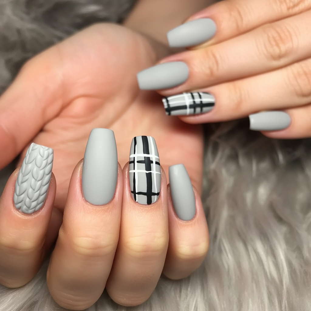 1. Cozy Gray Matte with Plaid and Knit Accents