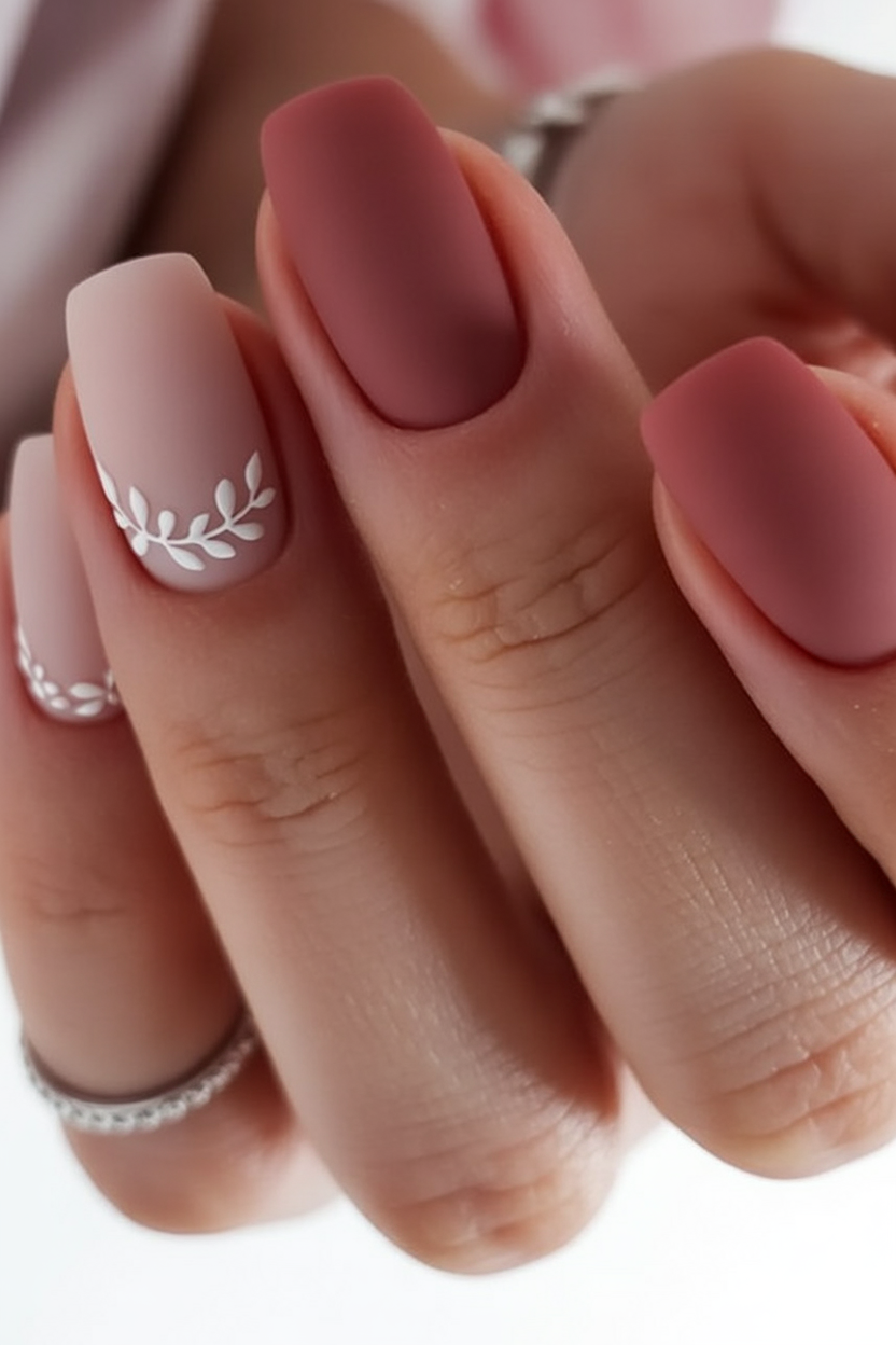 The soft blush collides with rich berry in this romantic matte combination that has the sensation of a walk through a rose garden right after the leaves have just begun to fall. The leafy white accents give it a delicate feminine touch, especially if one is after a pretty, polished look with a hint of whimsy.
