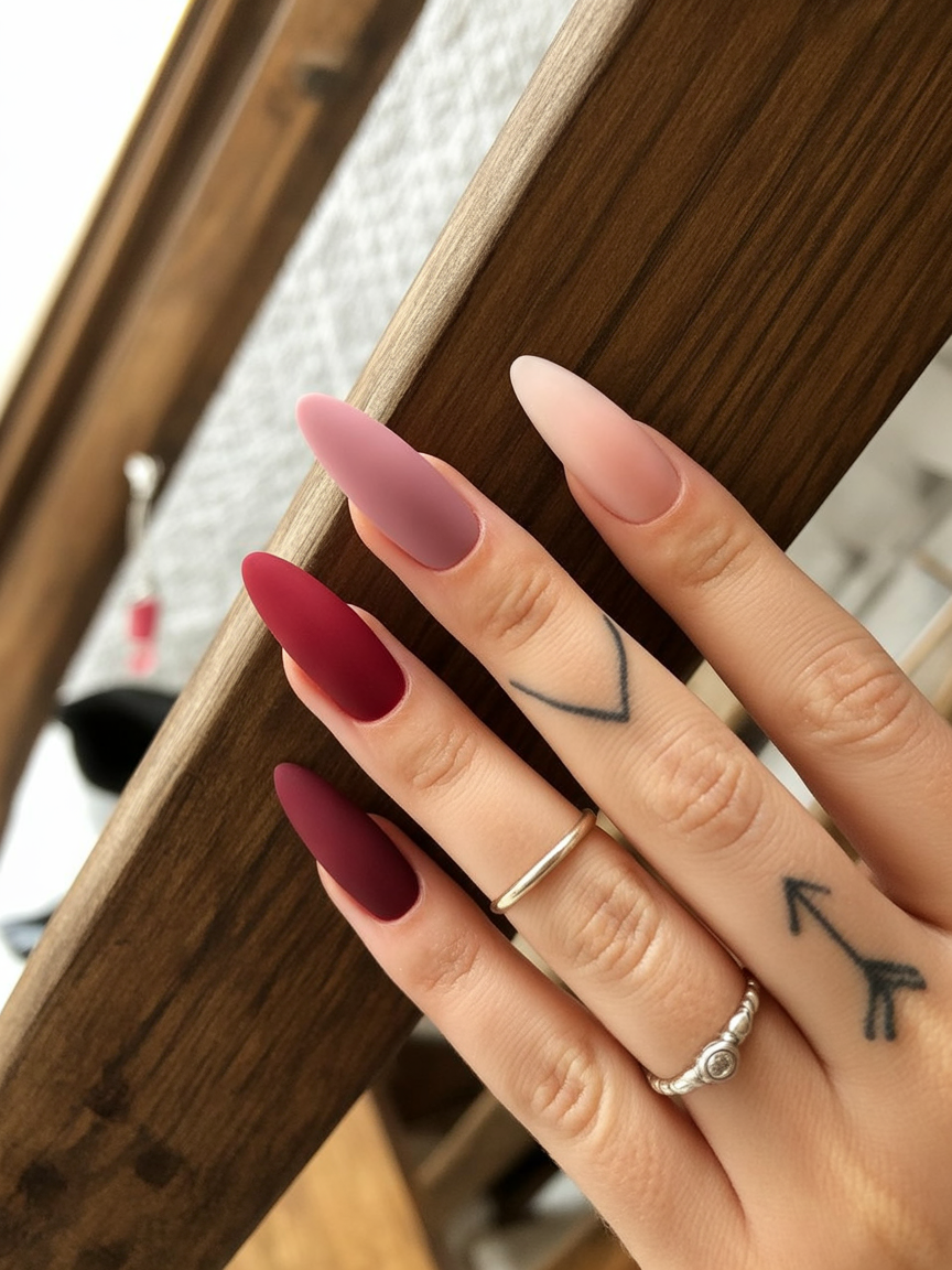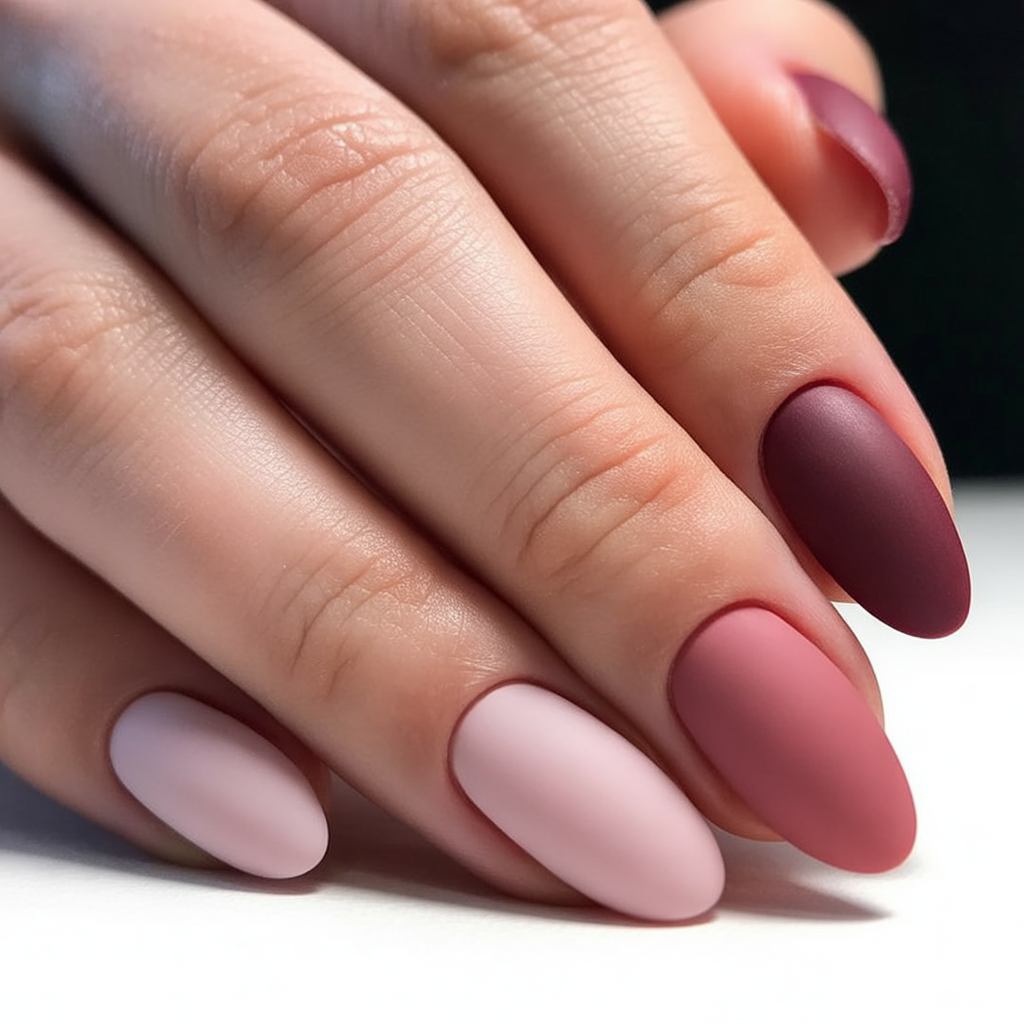 Starting by almost-black wine at the top to barely a nude pink at the bottom, this ombr set works perfectly to achieve a sexy and romantic effect at the same time. The matte finish makes it a bit less dramatic to balance the colors, but the colors do not need to talk much since they are all rich berry tones. It is the mani that makes you want to grab your softest scarf and go to a bookstore cafe.