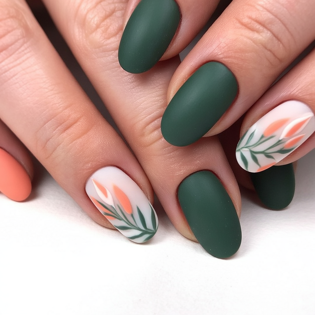 If you’re craving design ideas that lean into autumn without relying on typical oranges or browns, this one’s for you. The reason these medium-length coffin nails are fantastic to exhibit art is that the matte finish makes the overall feel modern and classy.