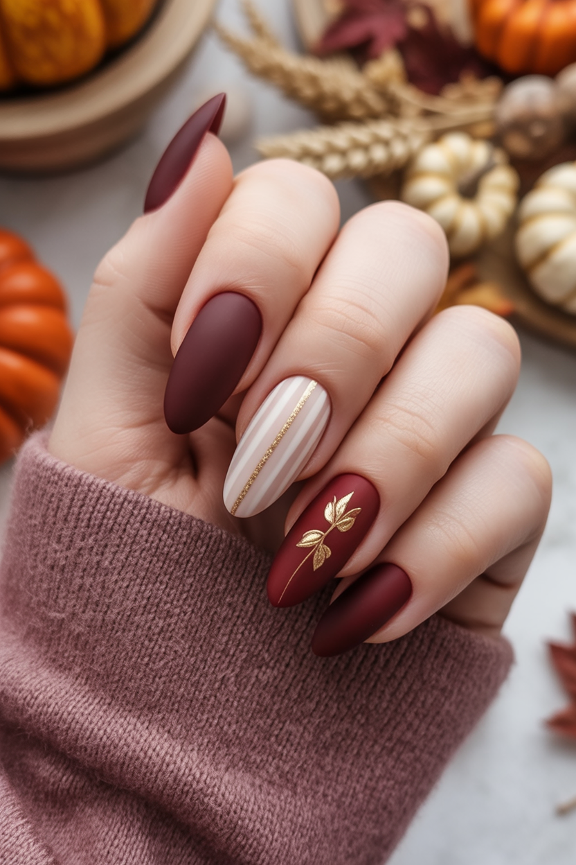 Burgundy and creamy neutrals with a hint of gold can be interpreted as the essence of the fall. The matte fare of this set accompanied by fragile decoration of leaves is very classically elegant. The cream nail with a vertical gold stripe lengthens the hands without sacrificing their beauty, and this manicure gives a boost to confidence as soon as it is applied.