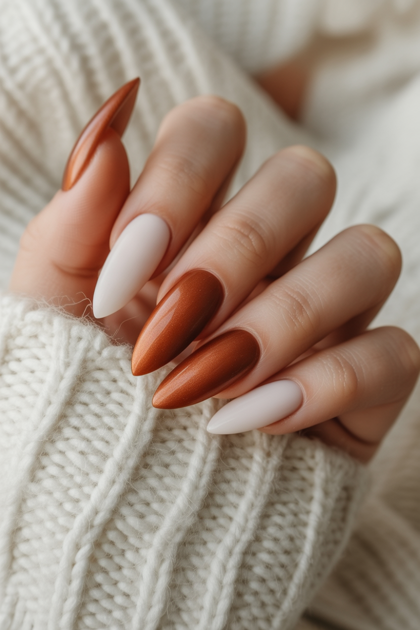 The perfect design to have on long nails, your nails are provided with drama and durability. This set takes color ideas that are making a statement to the next level, is better on almond or stiletto shapes and the copper shade is universally flattering.