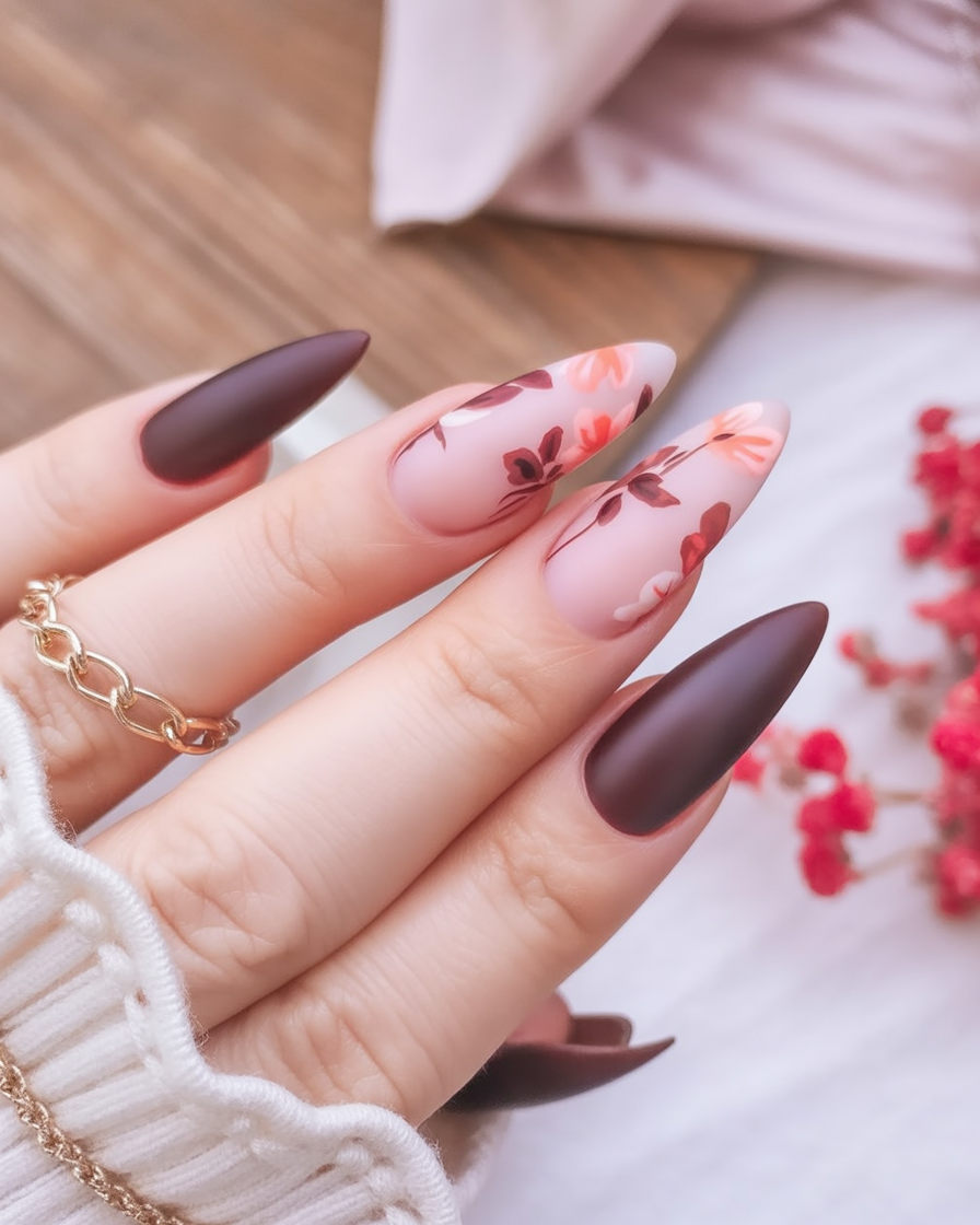 This look is ideal if you’re craving some fresh autumn inspo that isn’t your typical pumpkin orange. These will suit best in people who are fond of experimentation and desire unique appearance in a crowd and this is best when applied on the longer nails. All you need to do is to leave the floral accent nails and top it off with a matte topcoat to give a dreamy effect throughout the season.