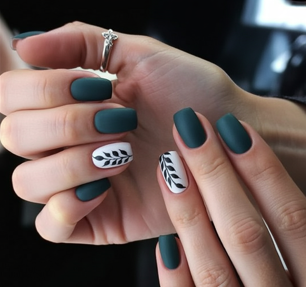 This grumpy green matte is the sort of bold color that can make your fall wardrobe go to the next level at once. The whimsical black-and-white details make it feel a bit more chic and modern, as though botanical art interpretive into nail art. When you want something grounded but bright, then this is your dish.