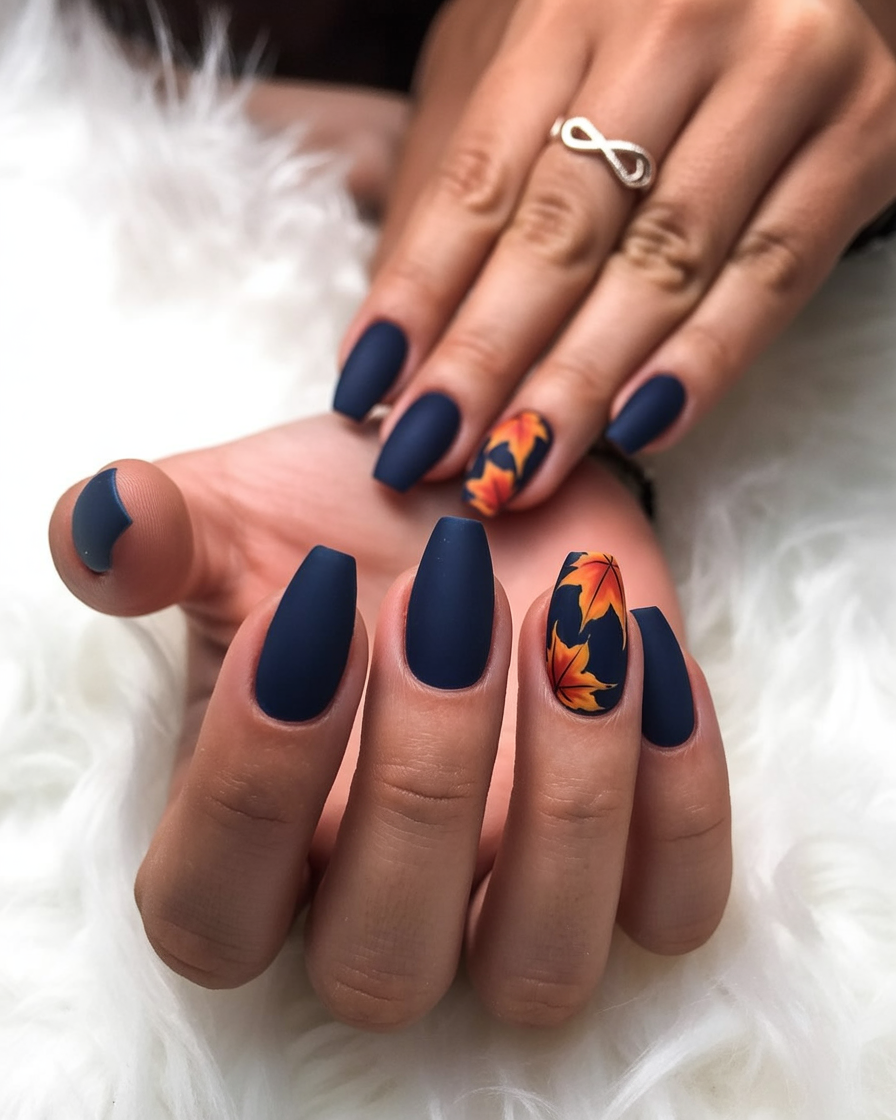 There’s something magical about the way crisp orange leaves pop against a deep navy backdrop. The entire essence of fall foliage is present in this look with an edgy moody color scheme that is not hard to wear. It is a talking point that reads, I love fall and I dress my nails with it.