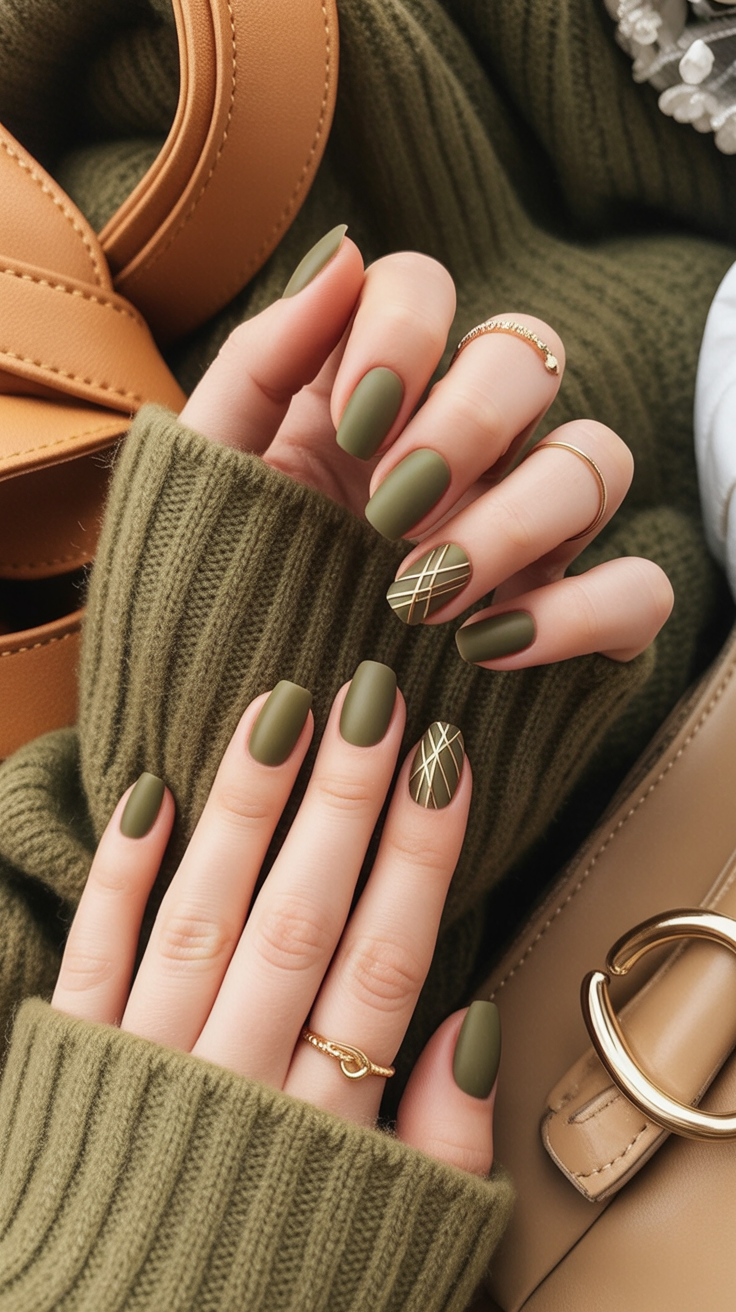 This one’s for all the cozy sweater lovers. Dull olive green and delicate plaid gold accents deliver serious hygge vibes, such as putting on cable knit nail wrap. It is simple but clever, just as a daily style ought to be but a bit fancy.