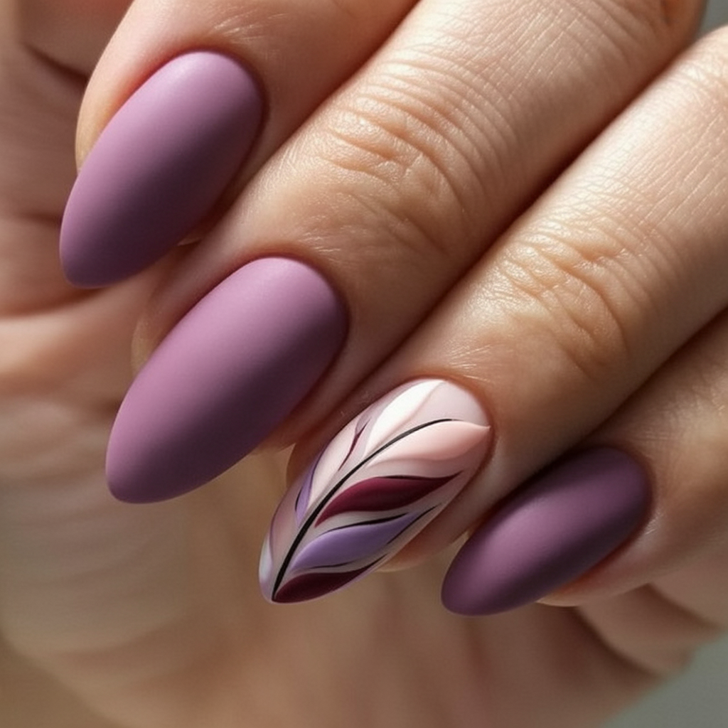 Dusty lavender has an artistic spin on it with this accented nail using feathers that are light, airy, and are effortlessly classy. It is just right to embrace color without being too striking, and that smooth matte makes it feel velvet-like that you will always feel like staring at it.