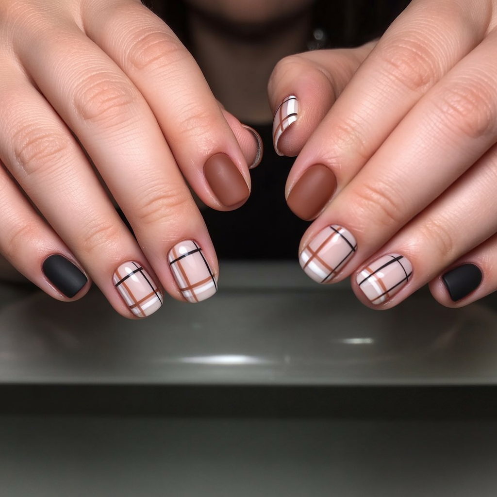 These short matte nails are giving cozy café chic. A new twist on patched up plaid, the contrast of warm browns, muted creamy beige, and matte black makes this style suavely editorial. It’s smart, stylish, and speaks volumes without being flashy.